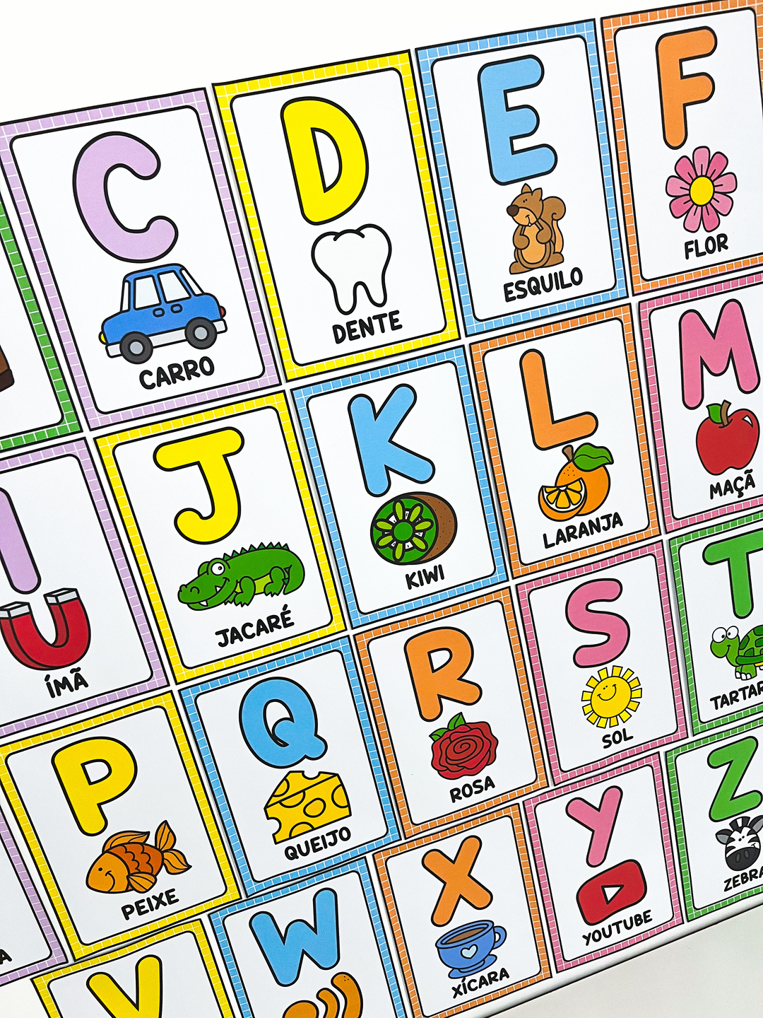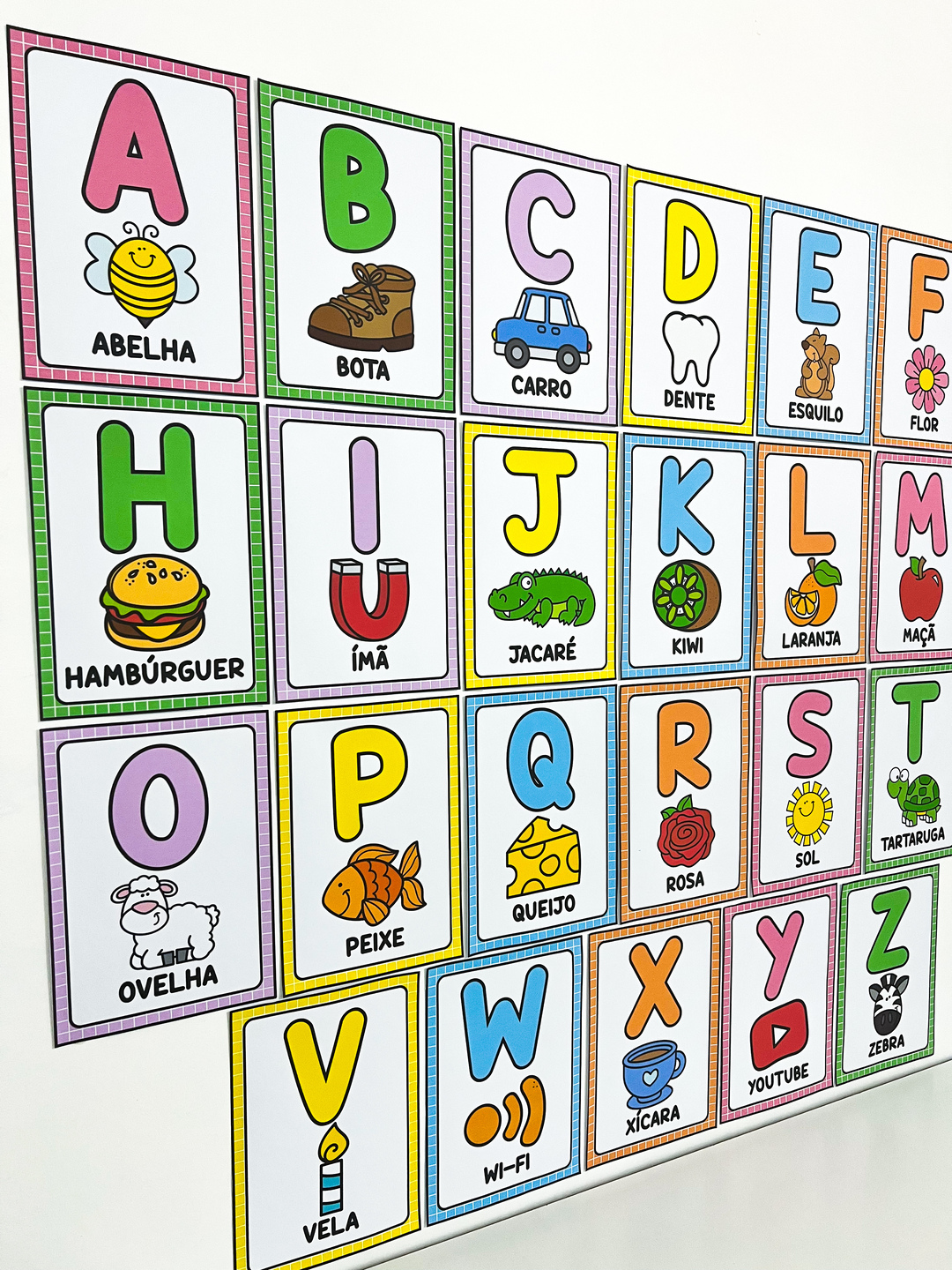 Alfabeto de parede ilustrado com letras grandes, coloridas e ilustrações atrativas que facilitam a associação entre letra inicial, som e imagem, tornando o processo de alfabetização mais lúdico e envolvente. Ideal para salas da Educação Infantil e Anos Iniciais, o material contribui para o reconhecimento das letras, ampliação do vocabulário e organização de um ambiente de aprendizagem alegre, estimulante e visualmente agradável.