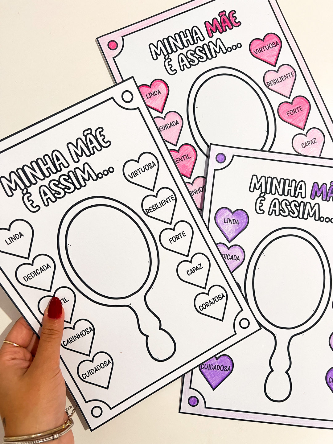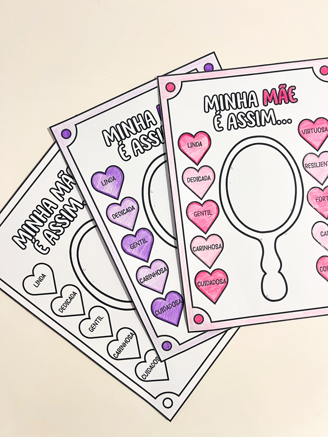 Esse recurso é ideal para ser trabalhado em sala de aula na semana do Dia das Mães, promovendo um momento especial de afeto e reconhecimento. É uma atividade criativa e afetiva desenvolvida para crianças do Ensino Fundamental I. A proposta convida os alunos a refletirem sobre as qualidades de suas mães, representadas em corações ao redor de um espelho desenhado no centro da folha. No espelho a criança deve desenhar o retrato da mãe.