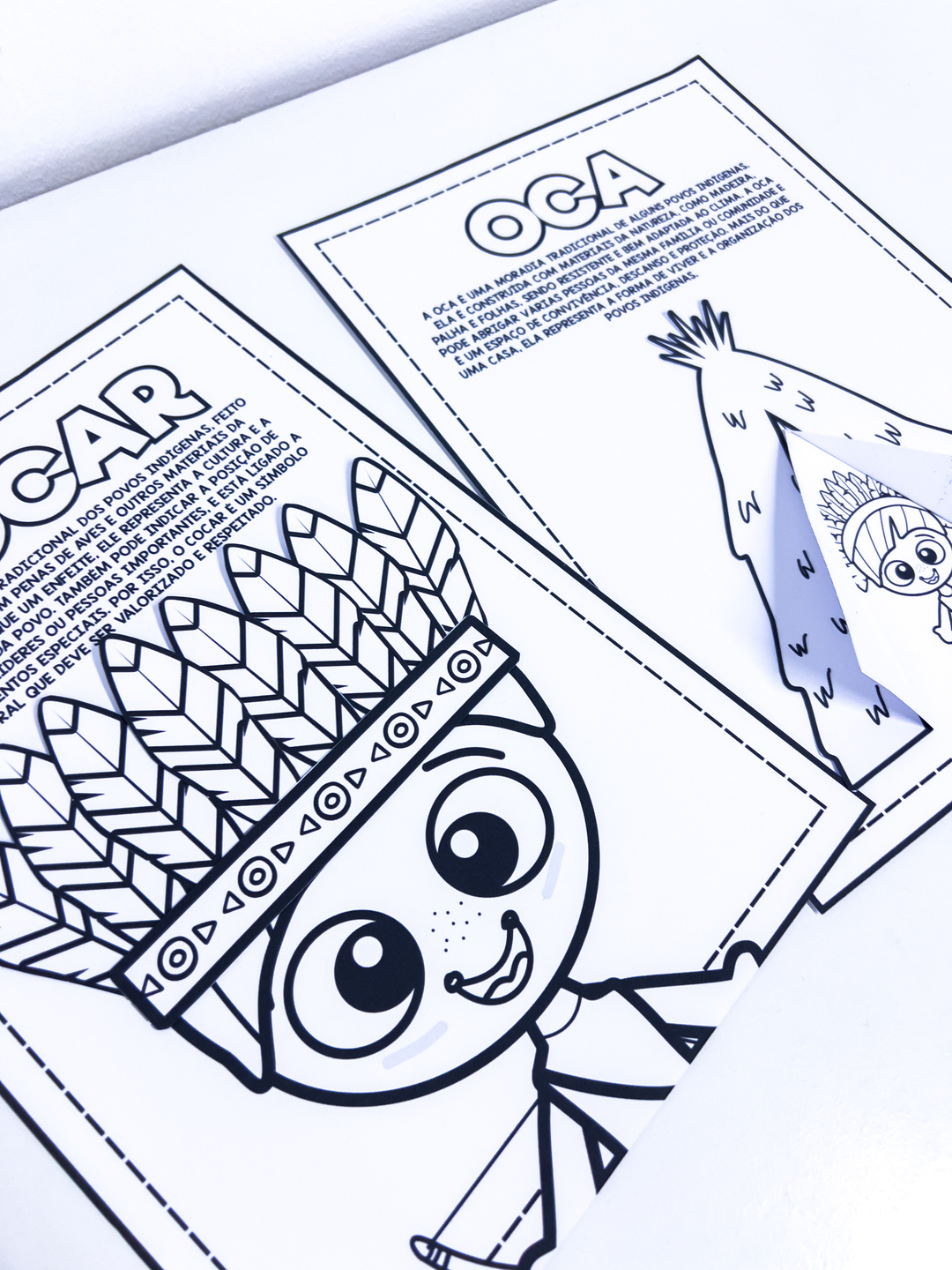 - Atividade da oca: apresenta uma explicação simples sobre a oca, acompanhada de uma proposta interativa para colorir e montar.