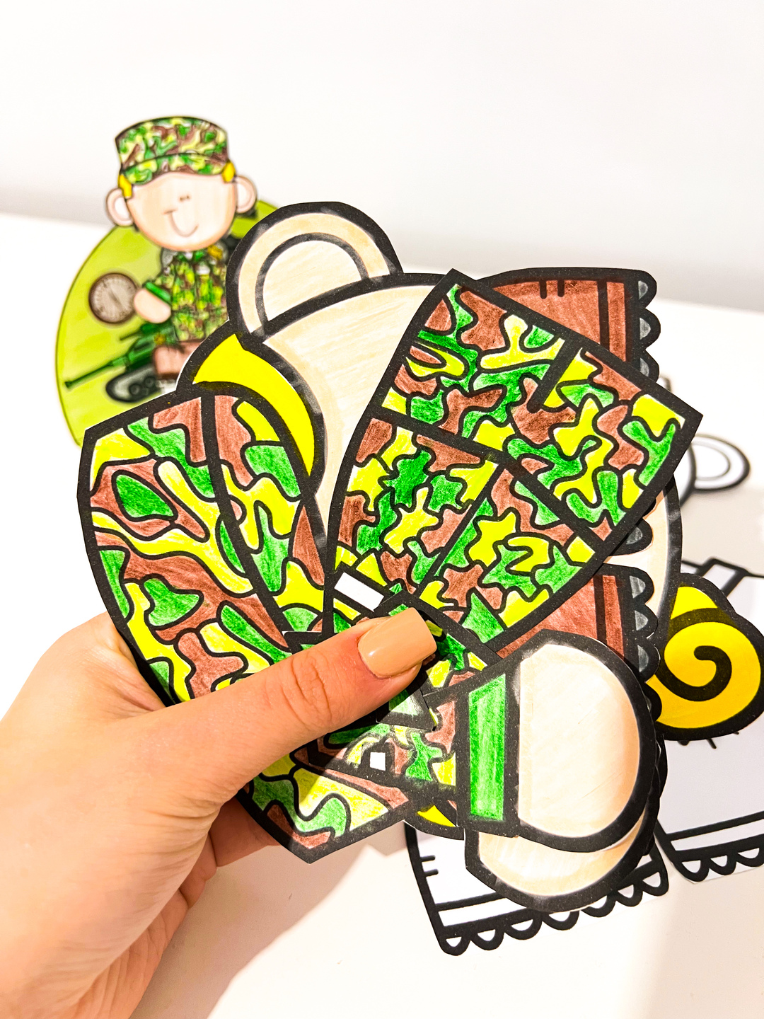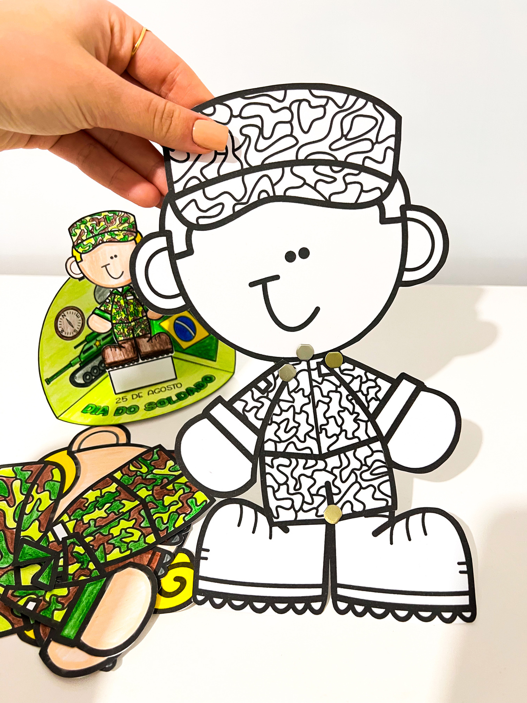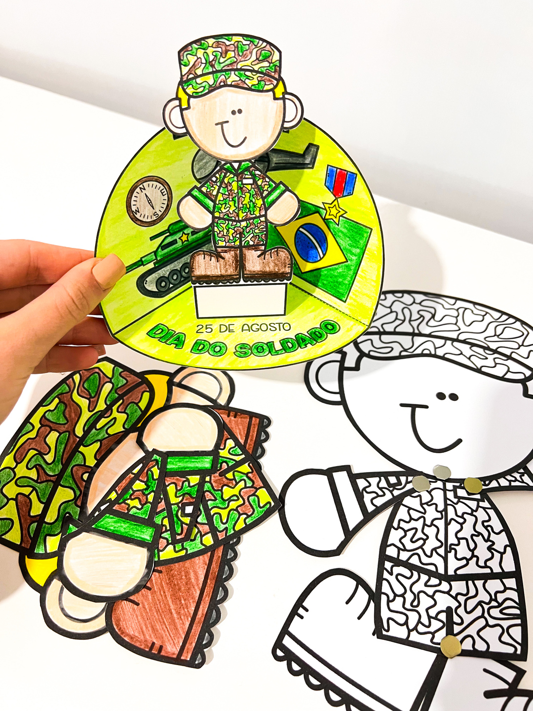 Atividades Interativas Dia do Soldado Este material foi desenvolvido para comemorar o Dia do Soldado (25 de agosto) de forma lúdica e interativa. Ele é composto por duas atividades criativas que estimulam a coordenação motora, a atenção, a imaginação e o aprendizado cultural: 1. Soldado articulado para montar e colorir – As crianças recortam, pintam e montam a figura de um soldado articulado com partes móveis, que podem ser presas com grampos de encadernação. Essa atividade trabalha motricidade fina, criatividade e reforça o tema da data. 2. Cenário interativo “Dia do Soldado – Um cenário que traz símbolos relacionados ao exército, como tanque, medalhas e a bandeira do Brasil. Nele, o soldadinho colorido pode ser destacado e fixado. Segue em PDF pronto para impressão - Atividade para colorir.