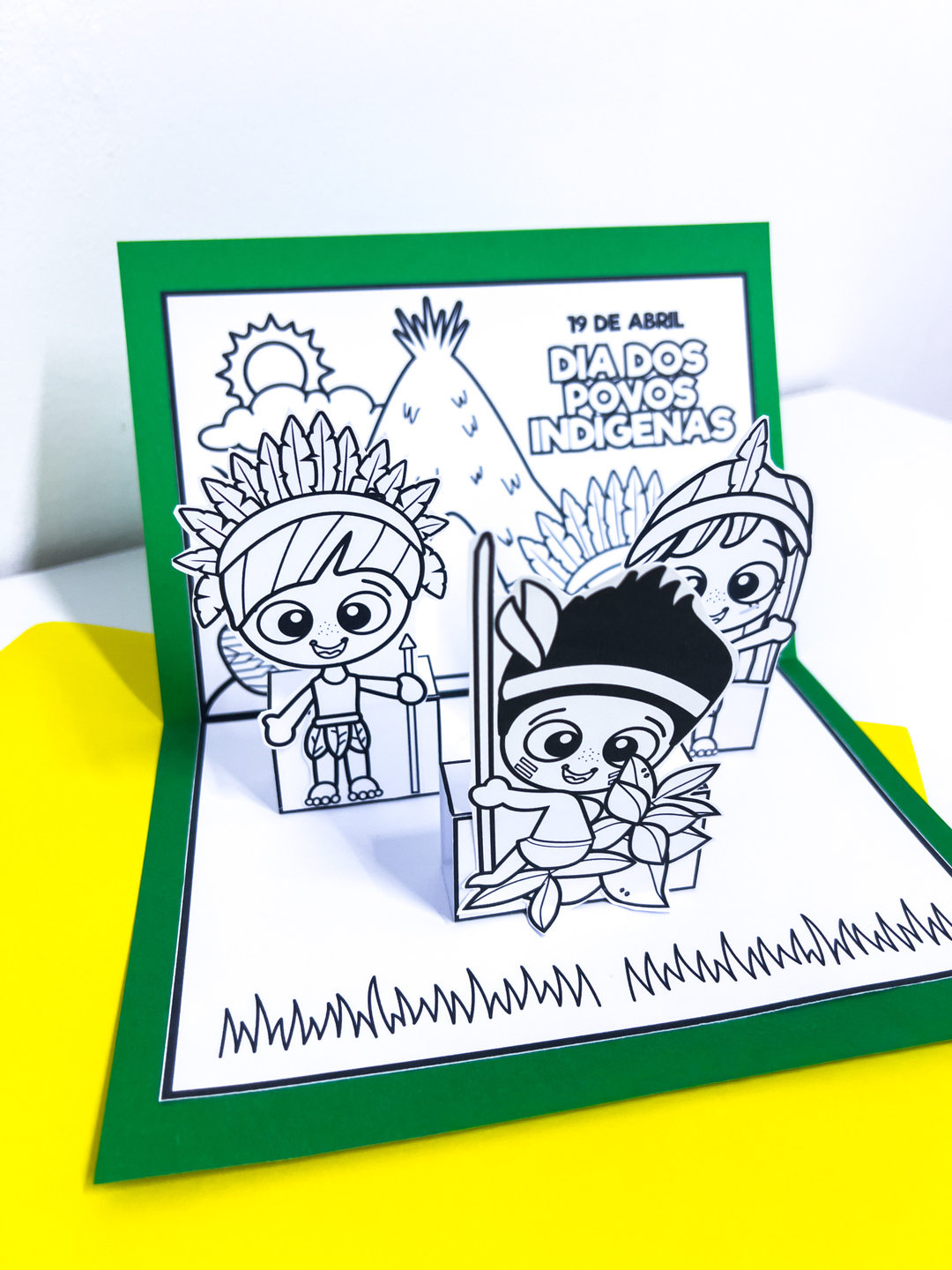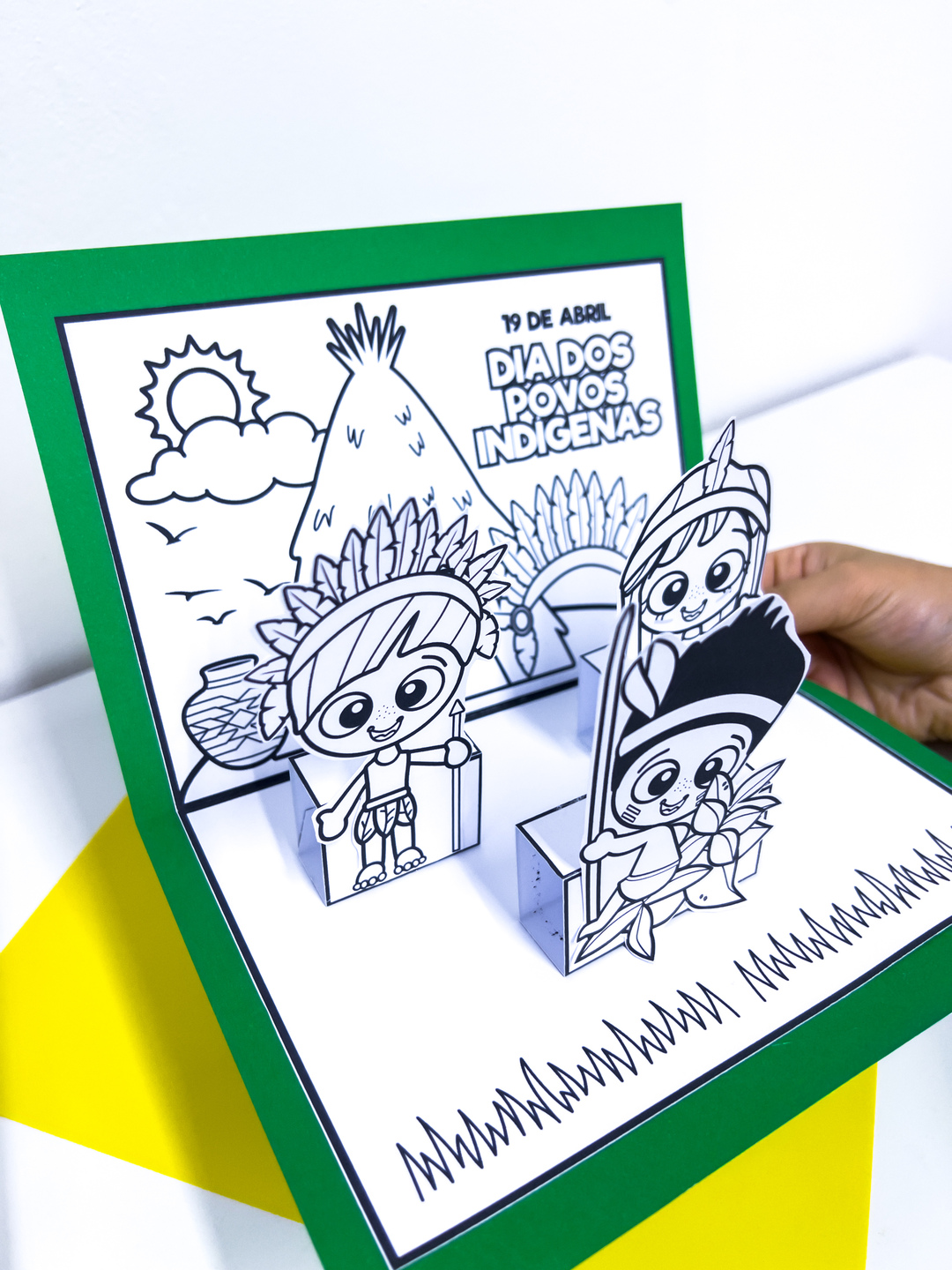 É um material pedagógico criativo e interativo que possibilita aos alunos montar um pequeno cenário tridimensional, estimulando a imaginação e o aprendizado sobre a cultura indígena. A proposta envolve recorte, colagem e montagem, tornando a atividade dinâmica e envolvente. O material é composto por duas folhas e está disponível em versão para colorir, permitindo que as crianças personalizem o cenário enquanto desenvolvem a coordenação motora, a criatividade e o interesse pelo tema. Ideal para complementar atividades sobre os povos indígenas de forma lúdica e significativa.