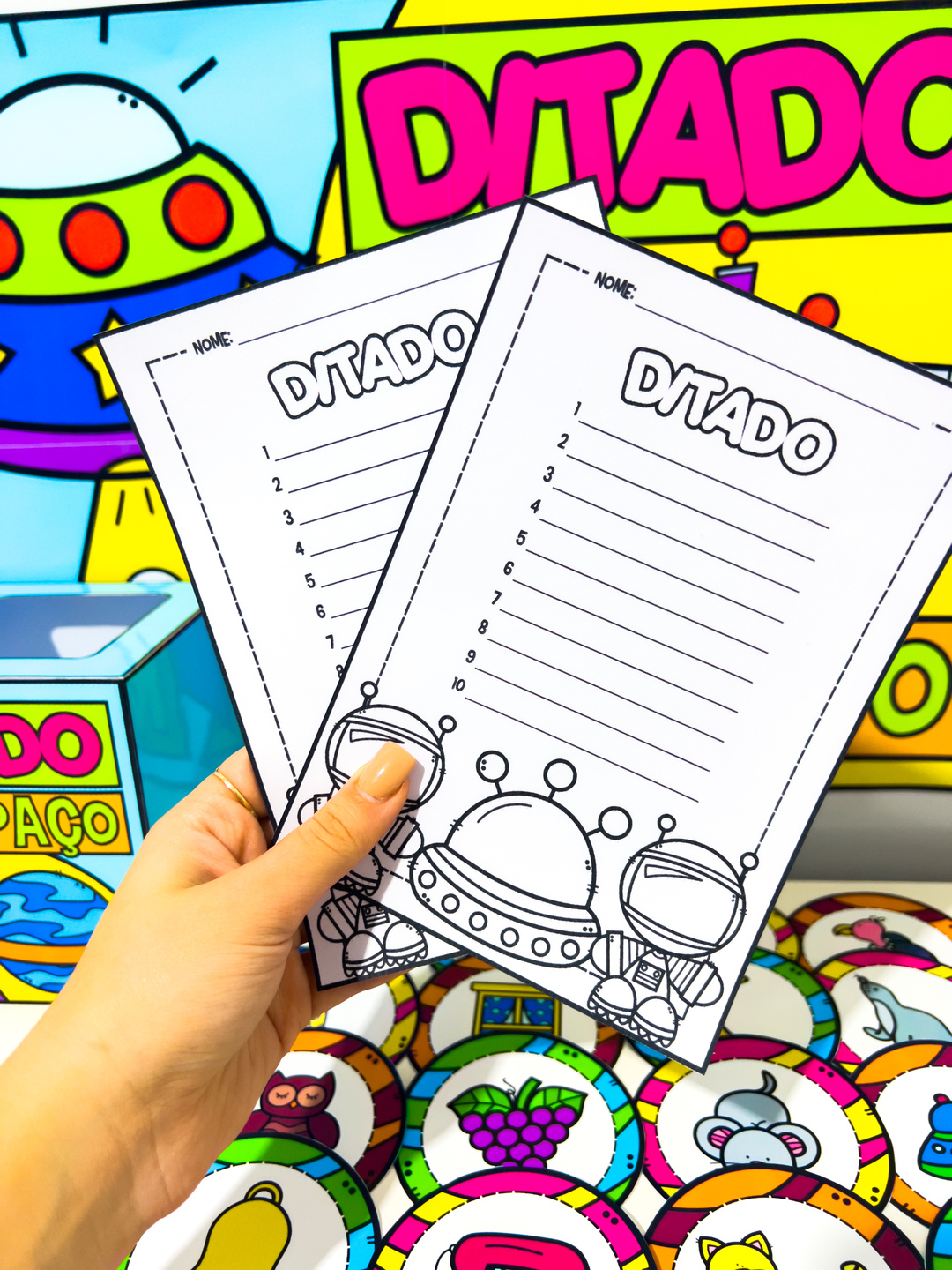 Ditado no Espaço é um recurso lúdico e envolvente que transforma o momento do ditado em uma verdadeira aventura intergaláctica! O material acompanha 36 fichas ilustradas com palavras de sílabas simples, uma folhinha para as crianças registrarem as palavras sorteadas, um painel em 4 partes cheio de cores e elementos do espaço e um molde de caixa para armazenamento. Com seu design vibrante e divertido, o material estimula a leitura, a escrita e a ortografia, deixando o aprendizado mais atrativo e prazeroso para as crianças. Ideal para usar em sala de aula ou em casa, ele une prática pedagógica e diversão.