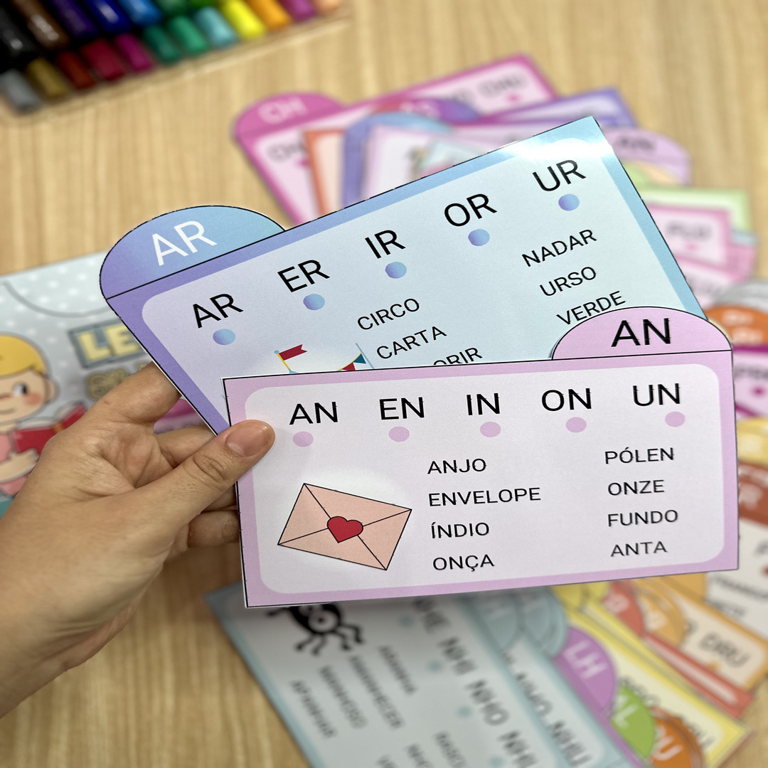 As fichas são organizadas por cores, e possuem indicação superior para facilitar a organização de acordo com as famílias silábicas.