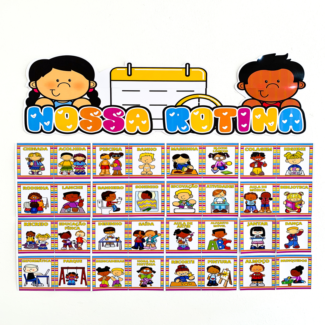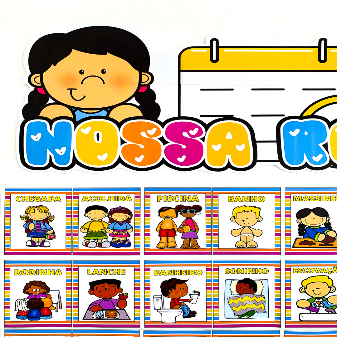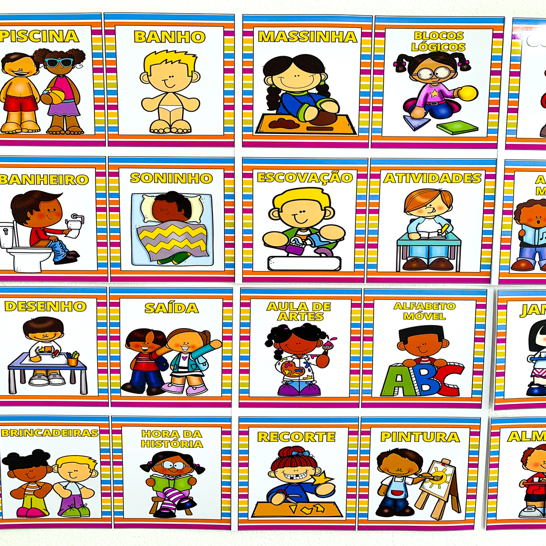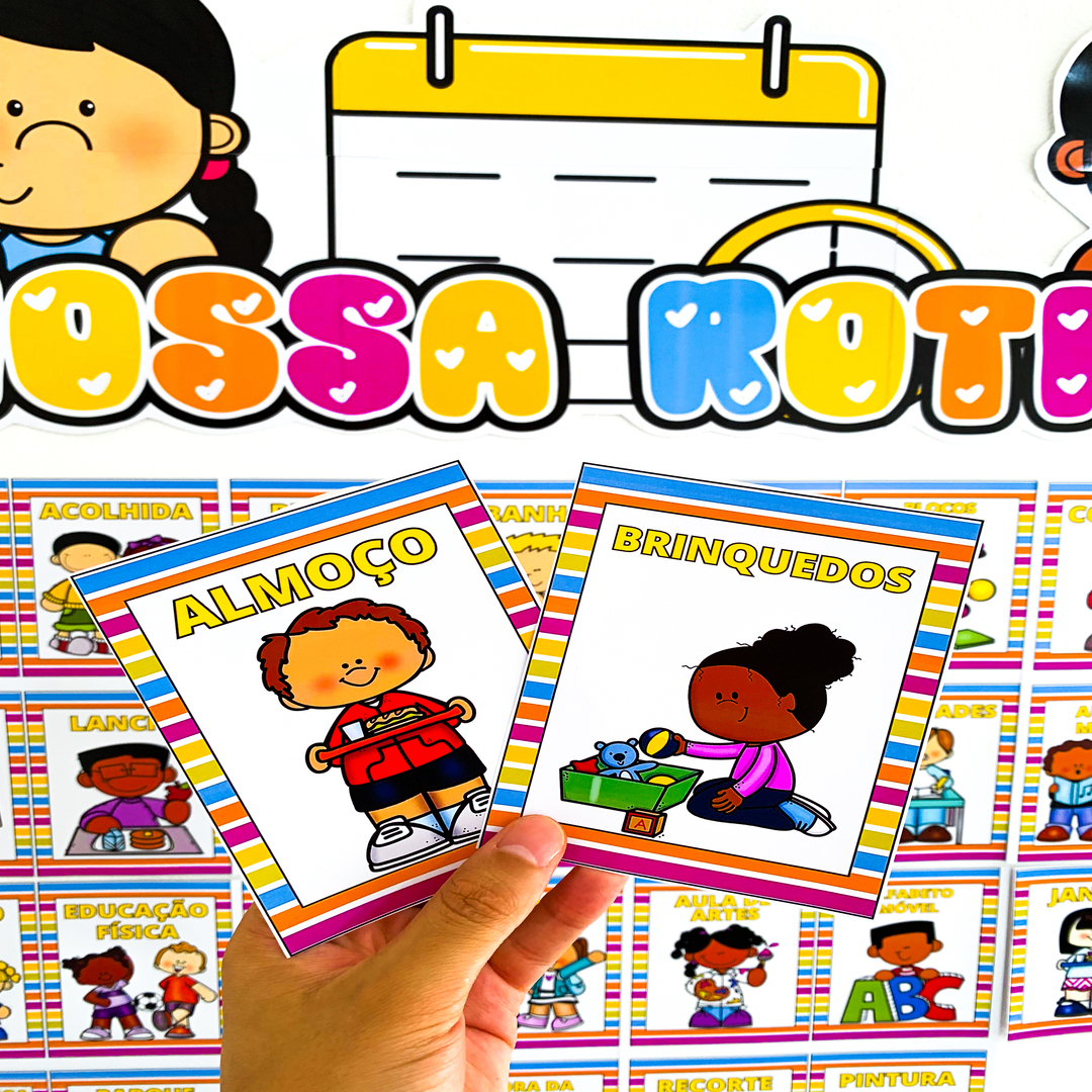 Cada ficha representa um momento do dia, como chegada, lanche, brincadeiras, hora do conto, entre outros, e conta com textos editáveis para se adaptar perfeitamente à rotina da sua instituição.