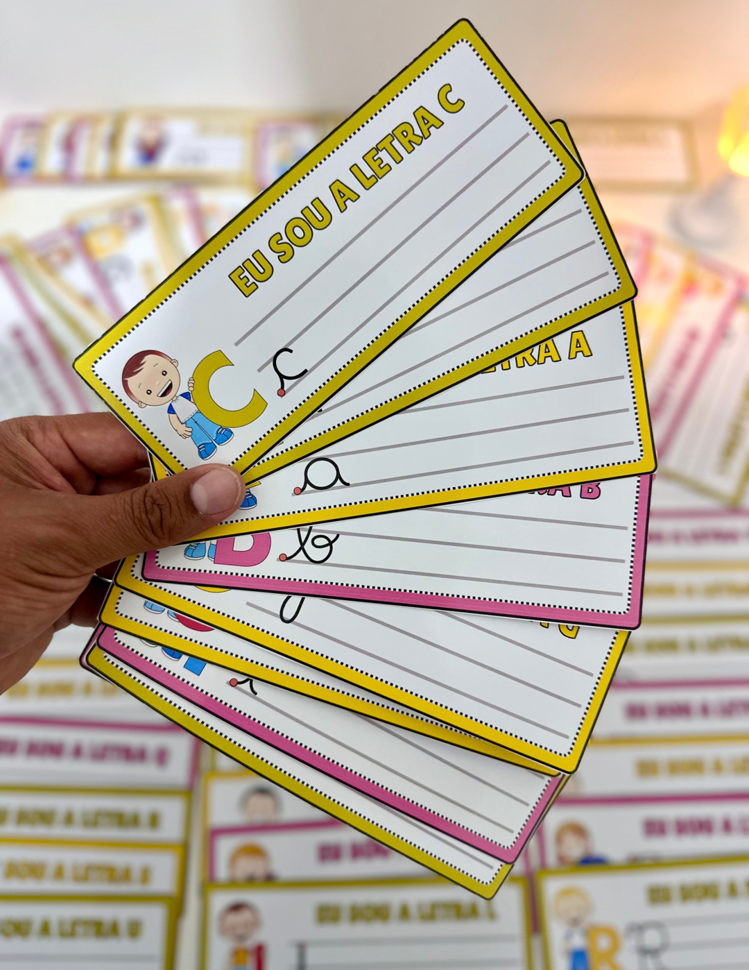 Fichas para treino do Traçado das letras do Alfabeto, para ser utilizado com crianças em fase de Alfabetização. O material vai com mais de 100 fichas para traçado, incluindo oAlfabeto nas 4 formas: - Bastão maiúscula - Bastão minúscula - Cursiva maiúscula - Cursiva minúscula Para utilizar a mesma ficha várias vezes recomendamos que passe o papel contact e utilize com caneta para quadro branco, dessa forma acriança consegue escrever e apagar com facilidade. O material vai em PDF pronto para impressão. Não editável.