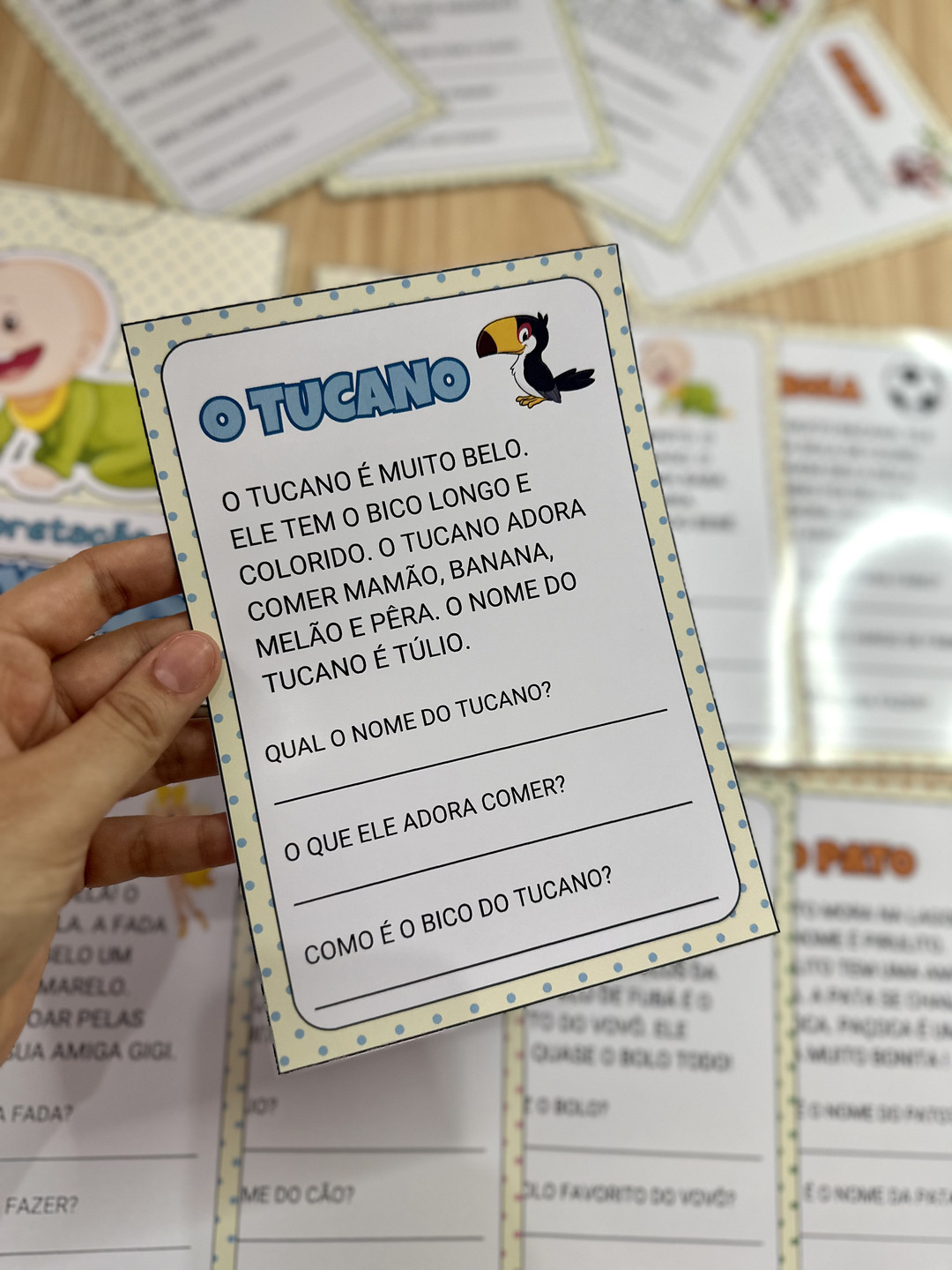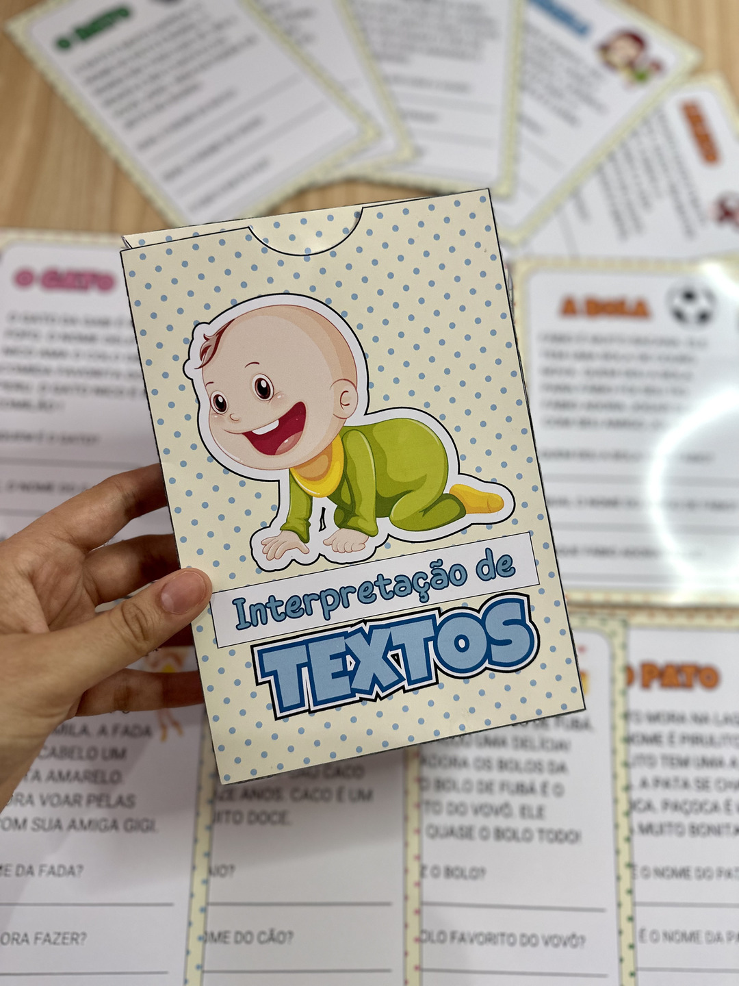 O arquivo "Interpretação de textos" inclui 12 textos curtos para leitura e interpretação, com 3 perguntas sobre cada texto. Esse material é ideal para crianças em fase de alfabetização, que já realizam leituras de pequenos textos porém ainda apresentam dificuldades em interpretação e compreensão leitora. O arquivo também acompanha uma caixinha para guardar o material. Essa sugestão pode ser utilizada como recurso, ou como atividade no caderno. Para maior durabilidade do material, recomendá-se impressão em papel de gramatura 180, e utilização de papel contact nos espaços a serem preenchidos, possibilitando que a criança escreva com caneta para quadro branco, e apague facilmente.