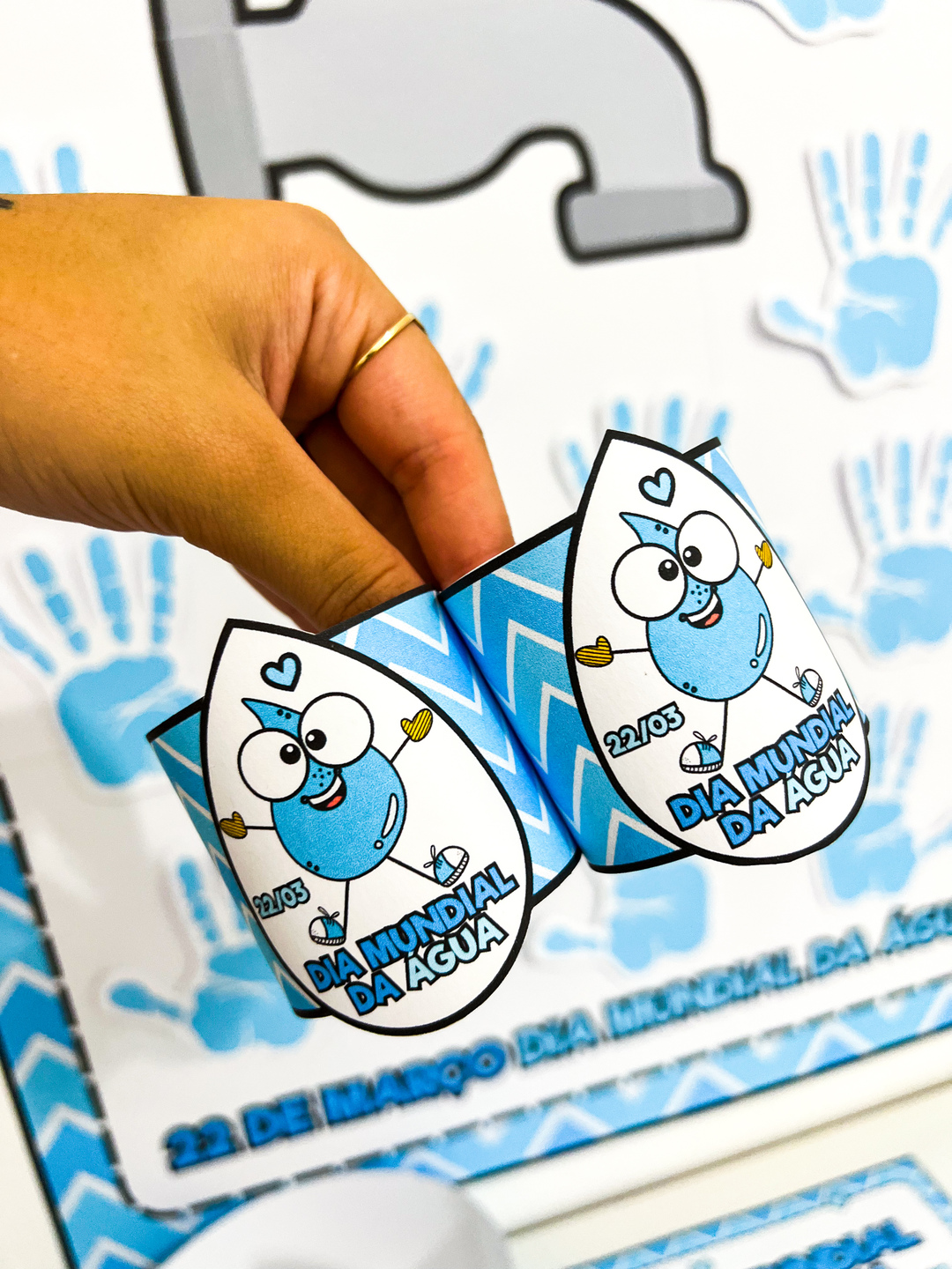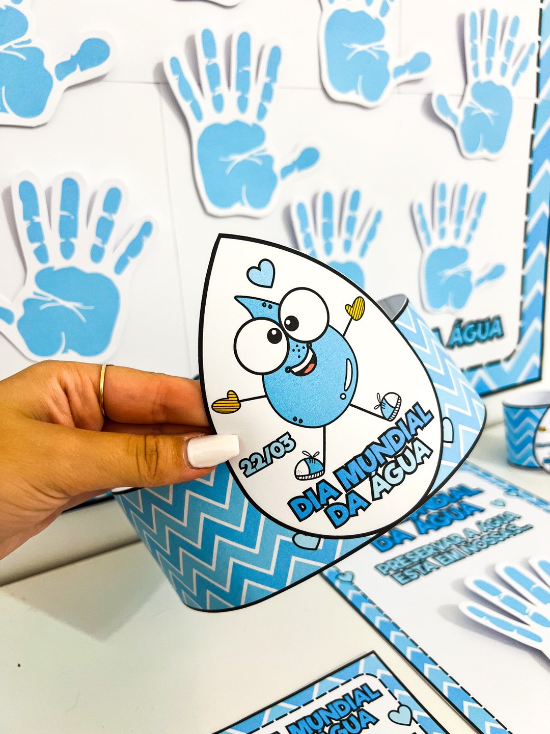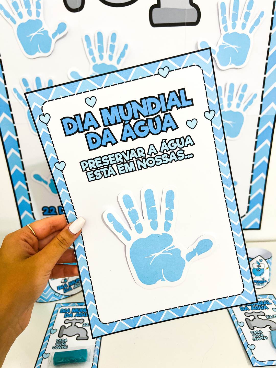 Este kit pedagógico do Dia da Água foi desenvolvido para trabalhar a data de forma lúdica, participativa e significativa com as crianças. As propostas incentivam a reflexão sobre a importância de preservar a água e cuidar do nosso planeta. O material contém: - Cartaz colaborativo para montagem em grupo - Coroa temática - Pulseira - Cartão Atividade interativa da mãozinha para registro das crianças Ideal para desenvolver consciência ambiental, criatividade e participação dos alunos na comemoração do 22 de março – Dia Mundial da Água. Arquivo em PDF com 13 páginas, pronto para impressão.