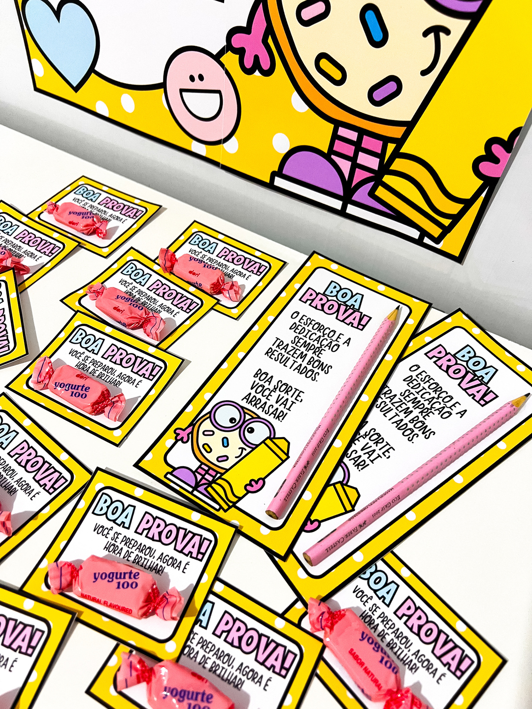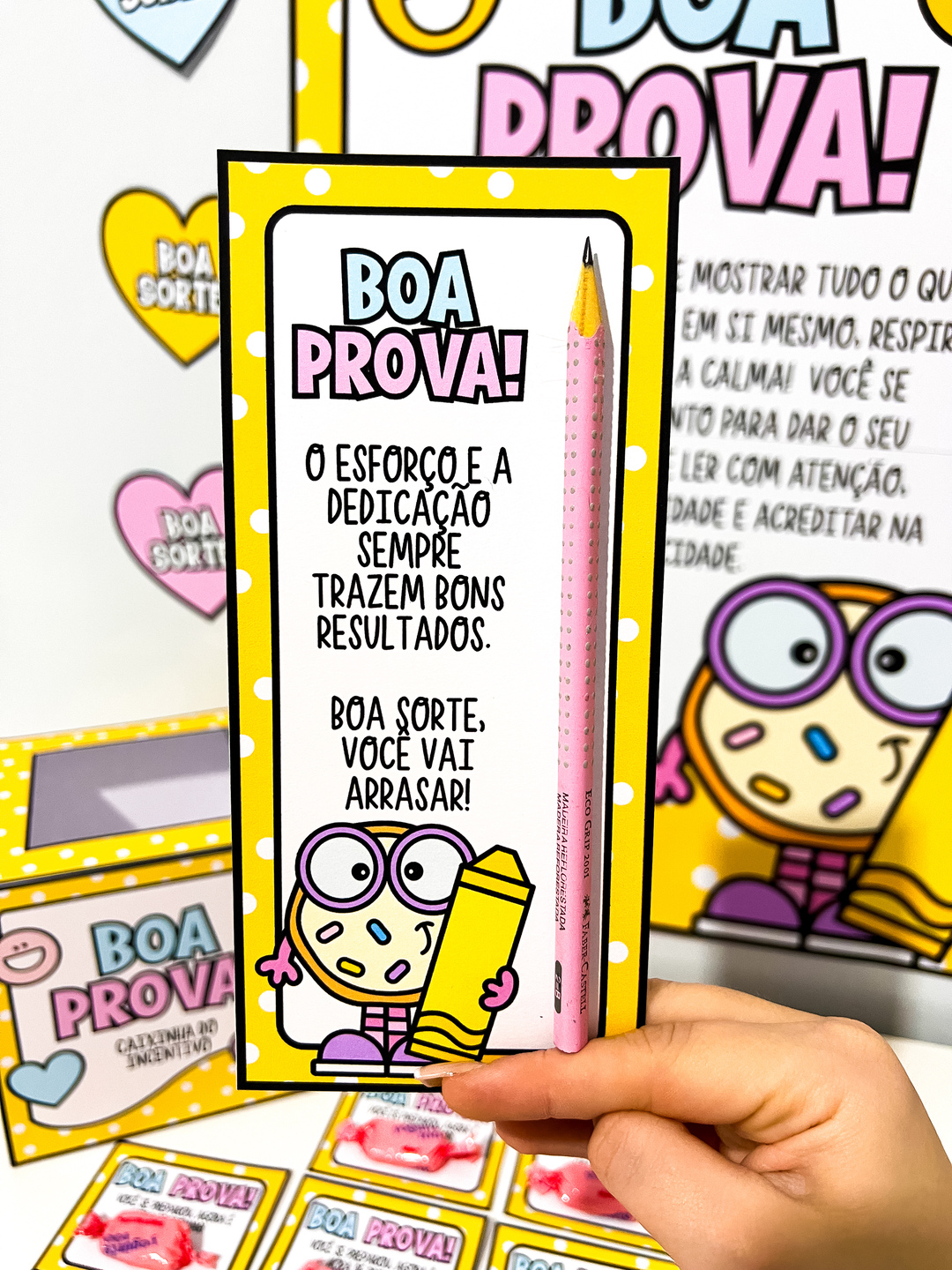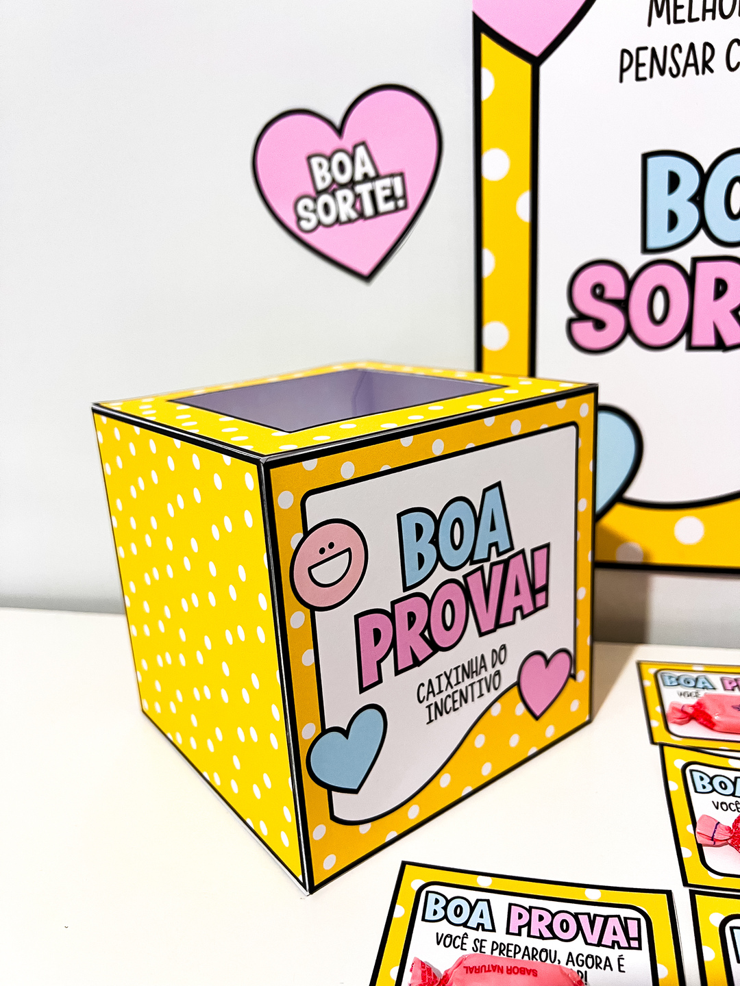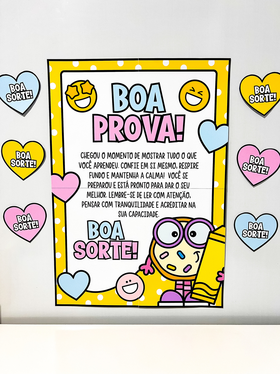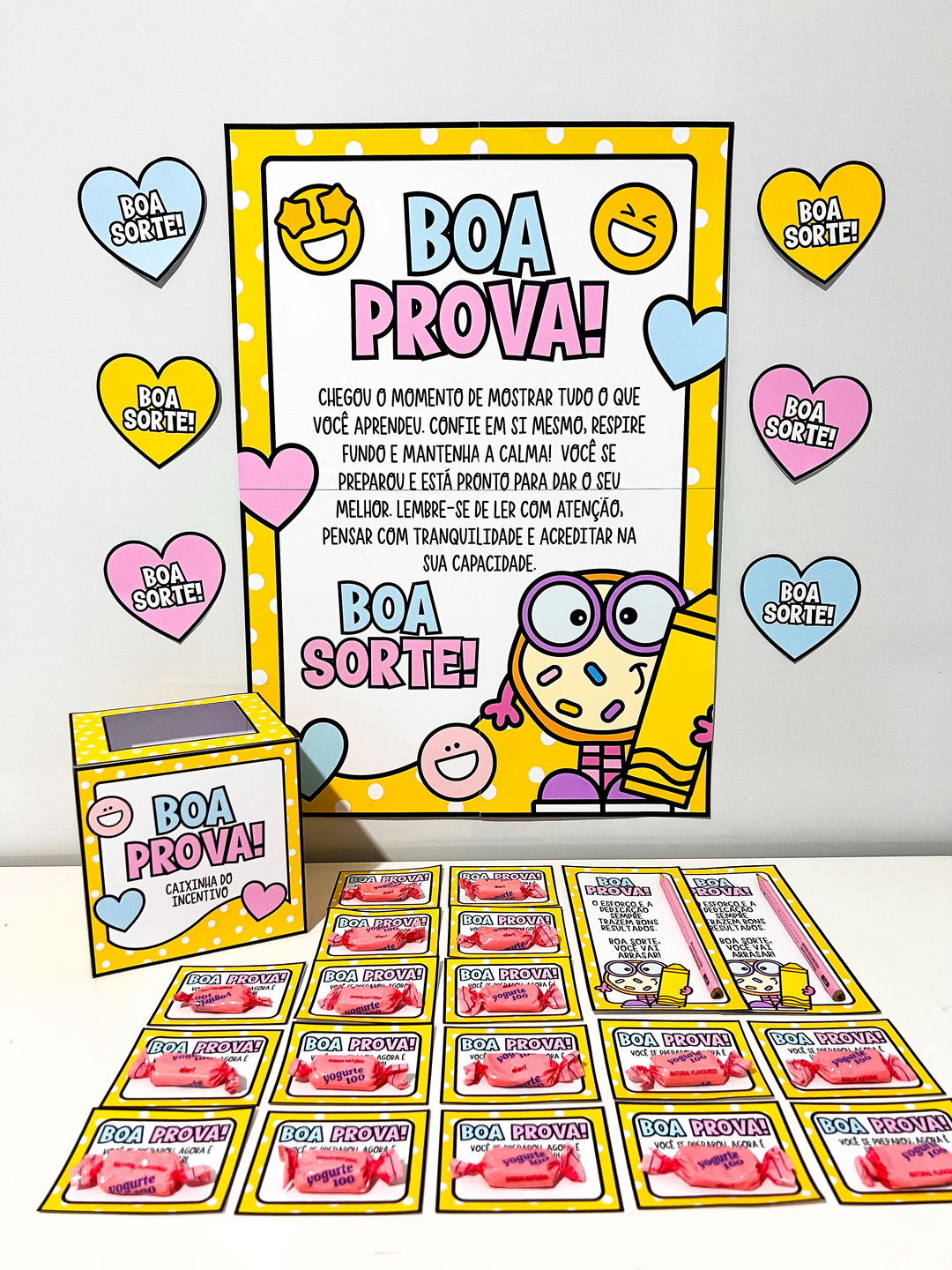 O Kit Incentivo Boa Prova! é um material lúdico e motivacional criado para incentivar os alunos nos dias de avaliação. Com cores alegres e mensagens positivas, o kit ajuda a reduzir a ansiedade e reforça a autoconfiança dos estudantes. O conjunto inclui: - Painel decorativo com mensagem de incentivo, ideal para expor na sala de aula e criar um clima acolhedor e encorajador; - Caixinha do incentivo, que pode ser usada para distribuir recadinhos, lápis ou doces como lembrancinhas antes da prova; - Cartõezinhos personalizados, com frases motivacionais e espaço para anexar lápis ou guloseimas, servindo como lembranças individuais para os alunos. O material trabalha o estímulo emocional e motivacional dos alunos, reforçando a importância do esforço, da calma e da confiança em si mesmos. É uma ótima ferramenta para professores que desejam transformar o momento da prova em uma experiência mais leve e encorajadora.