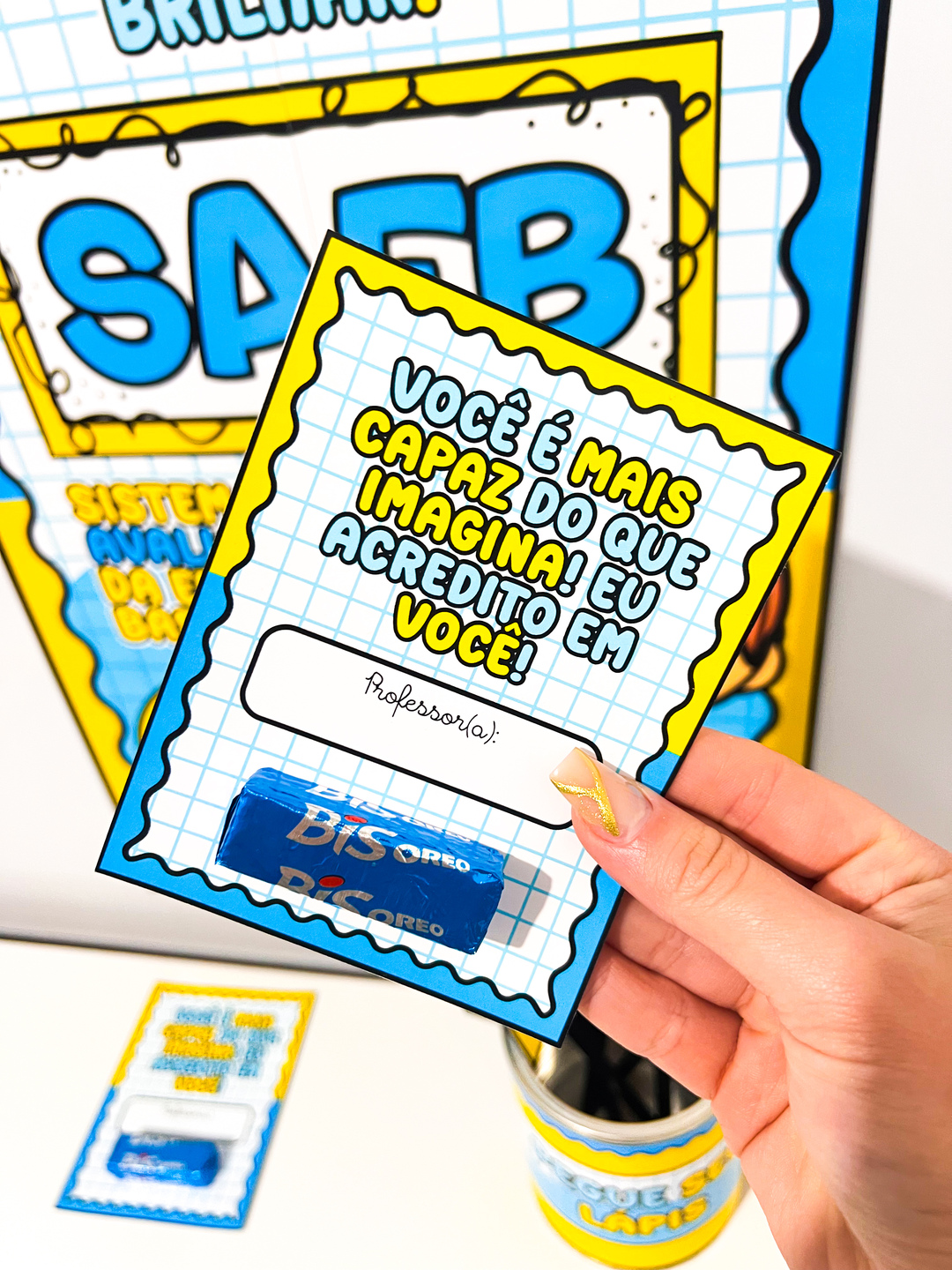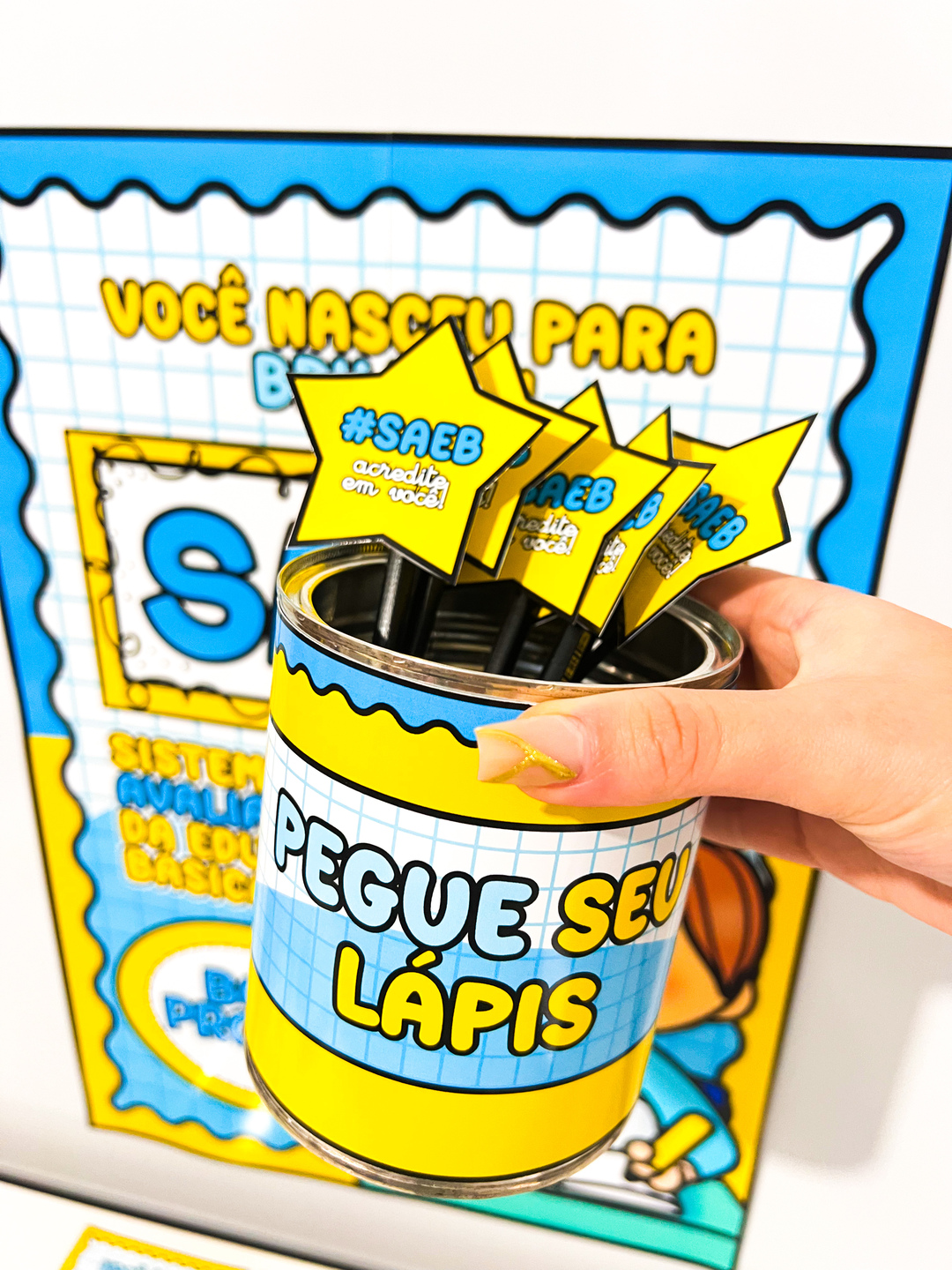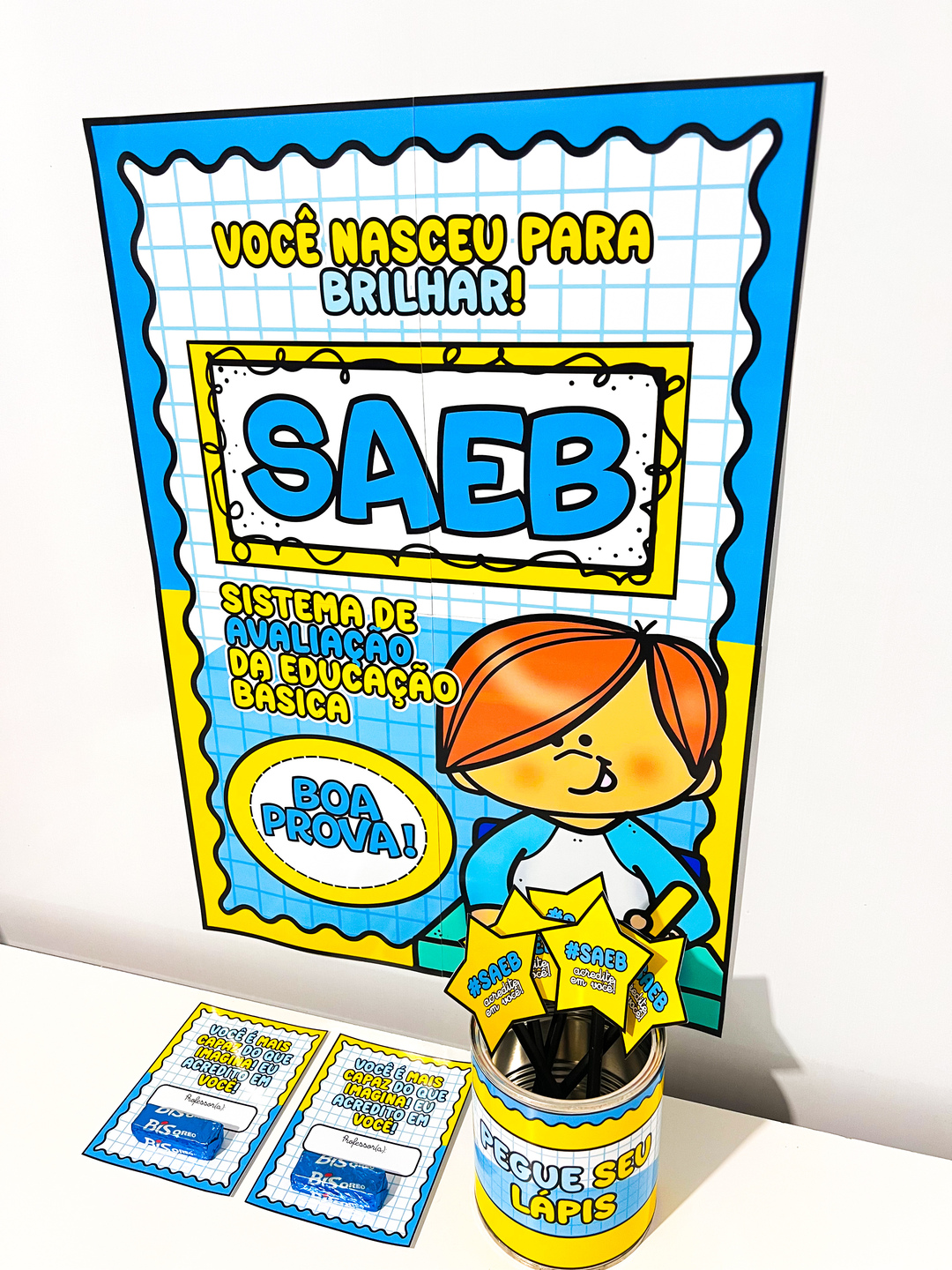 O Kit Incentivo Prova SAEB é um material pedagógico pensado para motivar os alunos de forma divertida e acolhedora durante a aplicação da avaliação SAEB. Ele contém um painel colorido e vibrante, composto por 4 folhas A4, com a frase principal "Você nasceu para brilhar!", acompanhada do nome da avaliação e ilustrações lúdicas. O kit também inclui: - Cartões de incentivo com frases motivacionais e espaço para colocar um mimo (como um chocolate BIS); - Ponteira de Lápis em formato de estrela, com hashtags e mensagens positivas; - Arte para Lata com a frase “Pegue seu lápis”, ideal para distribuir os lápis de forma organizada e temática.