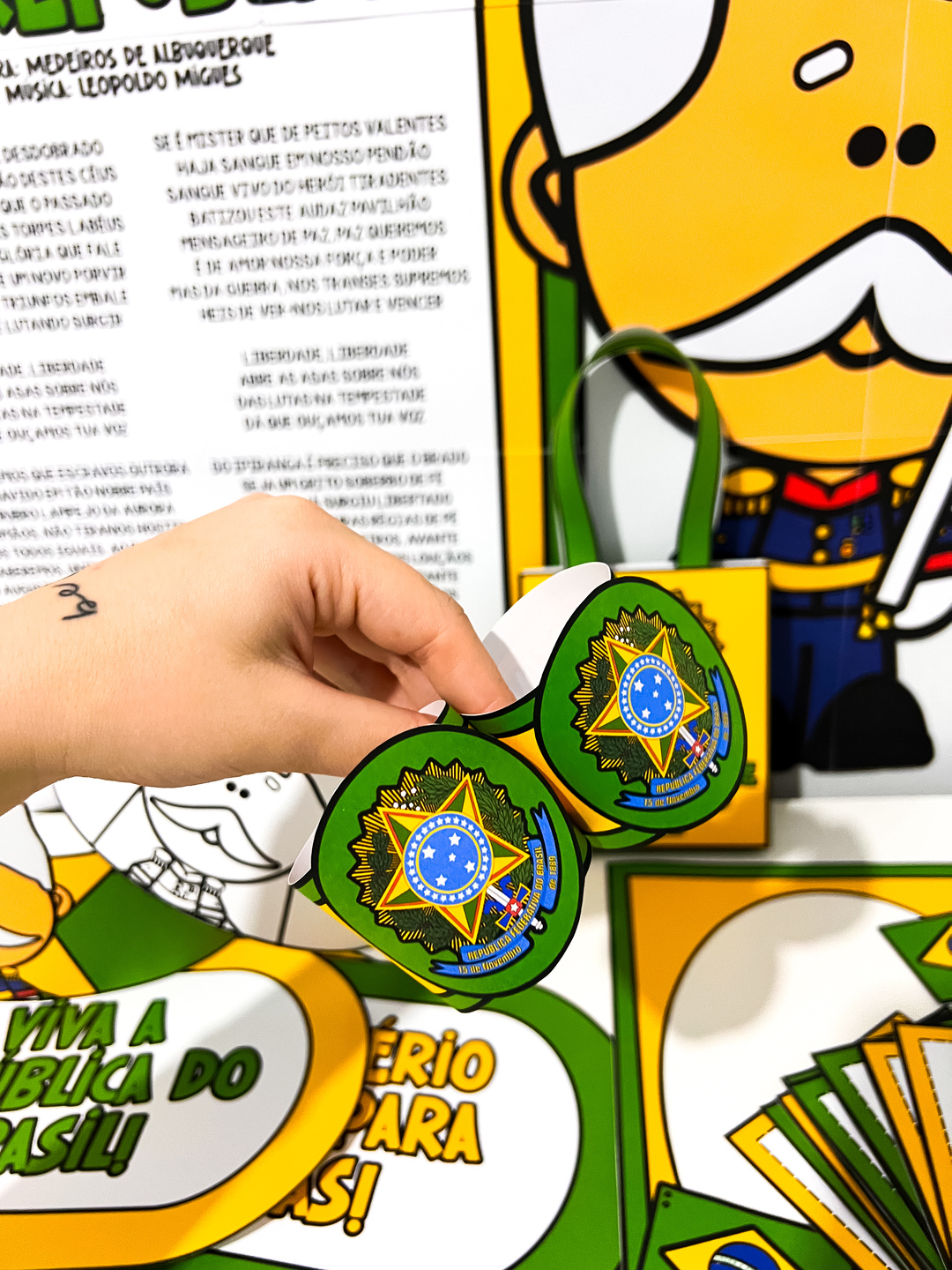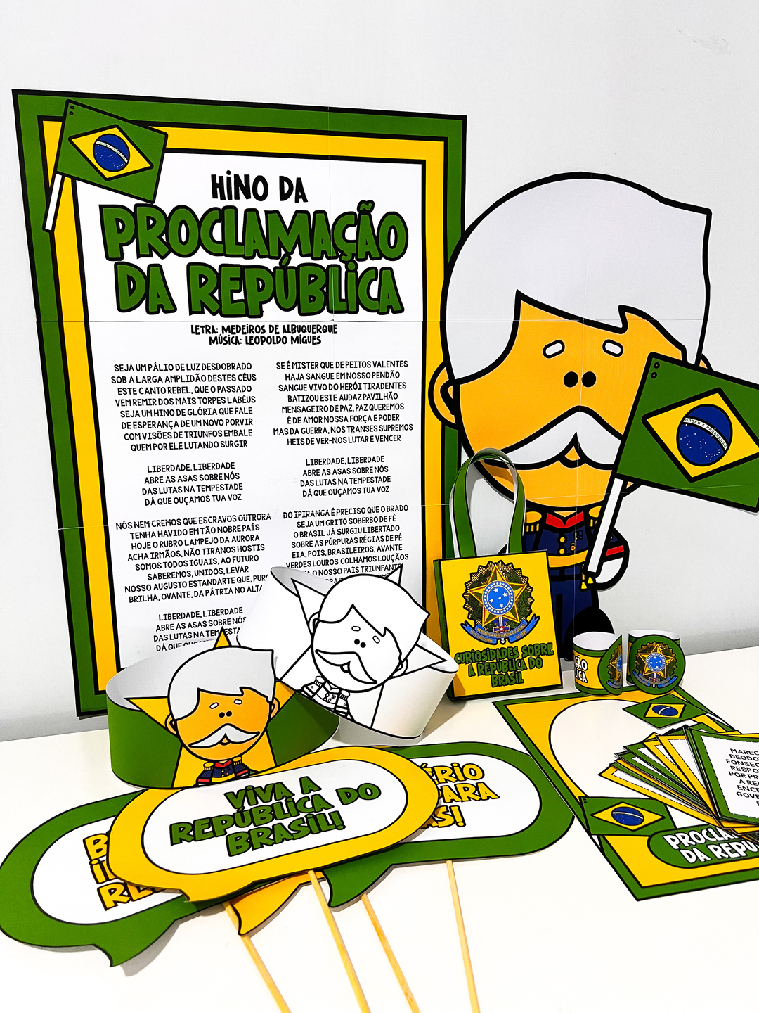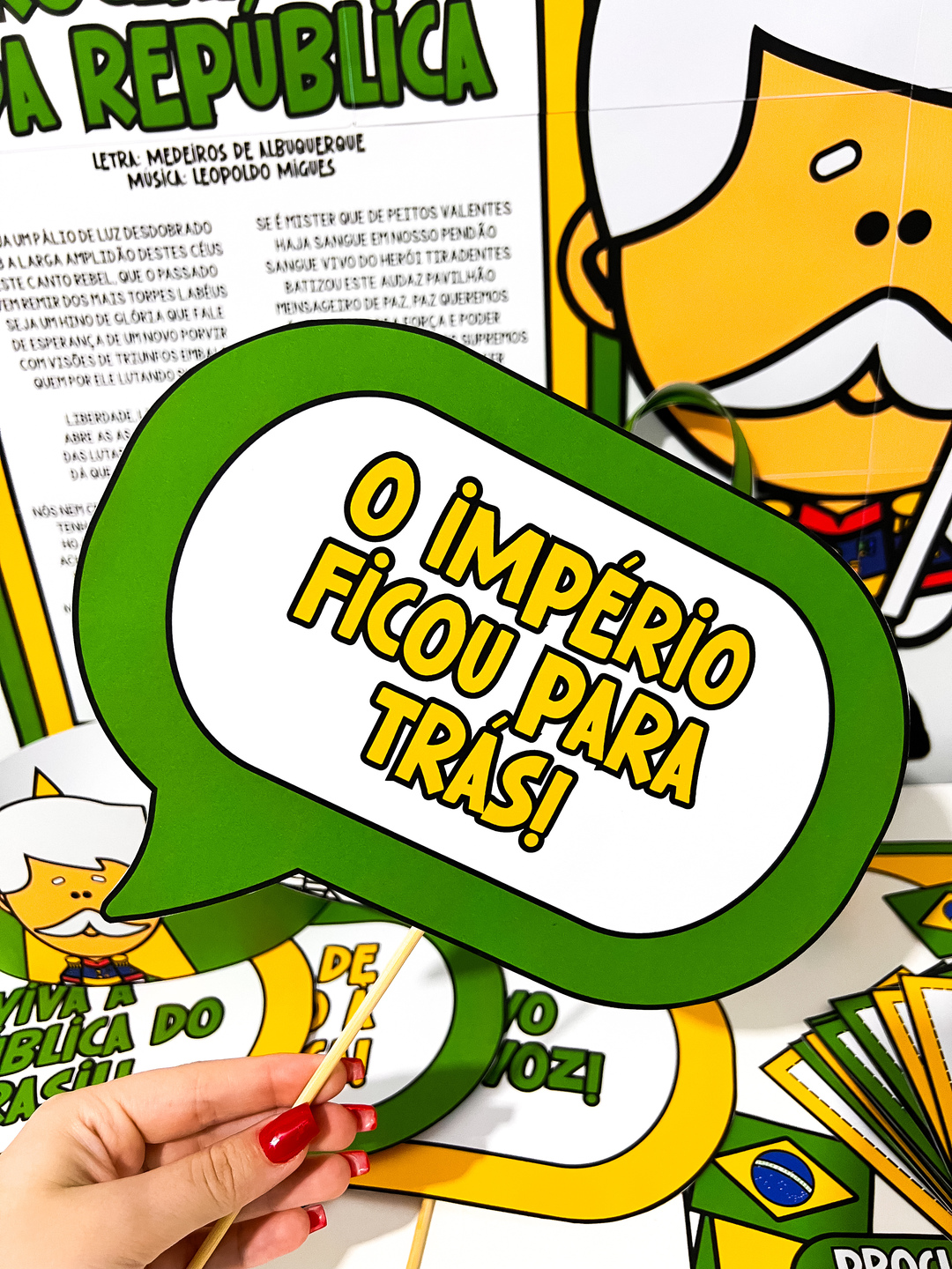 Com cores vibrantes e ilustrações atrativas, o kit une aprendizado histórico e diversão, sendo ideal para apresentações, murais, projetos e momentos comemorativos sobre a formação da República no Brasil.