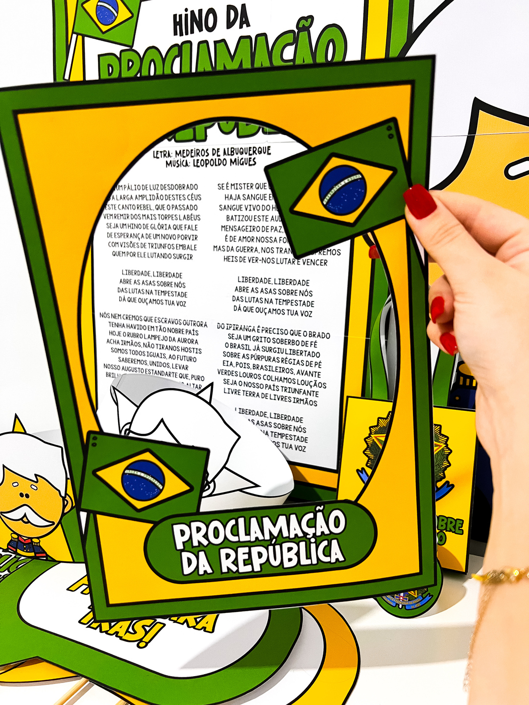 O material inclui um painel do Hino da Proclamação da República composto por 9 folhas, perfeito para murais  escolares.