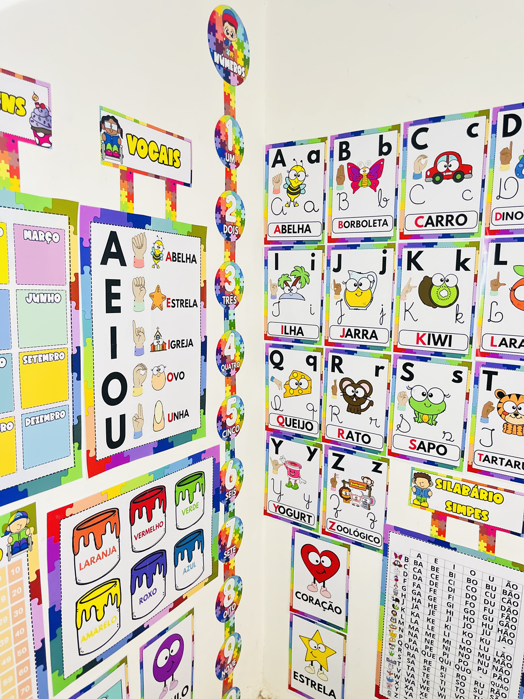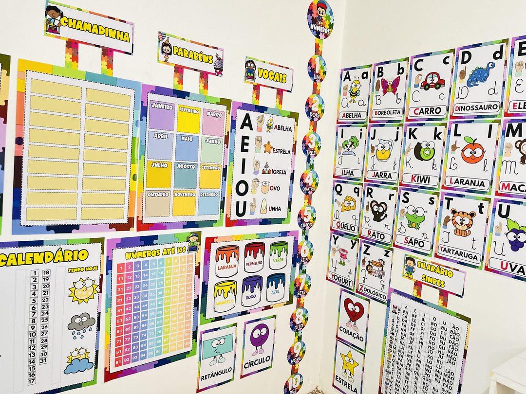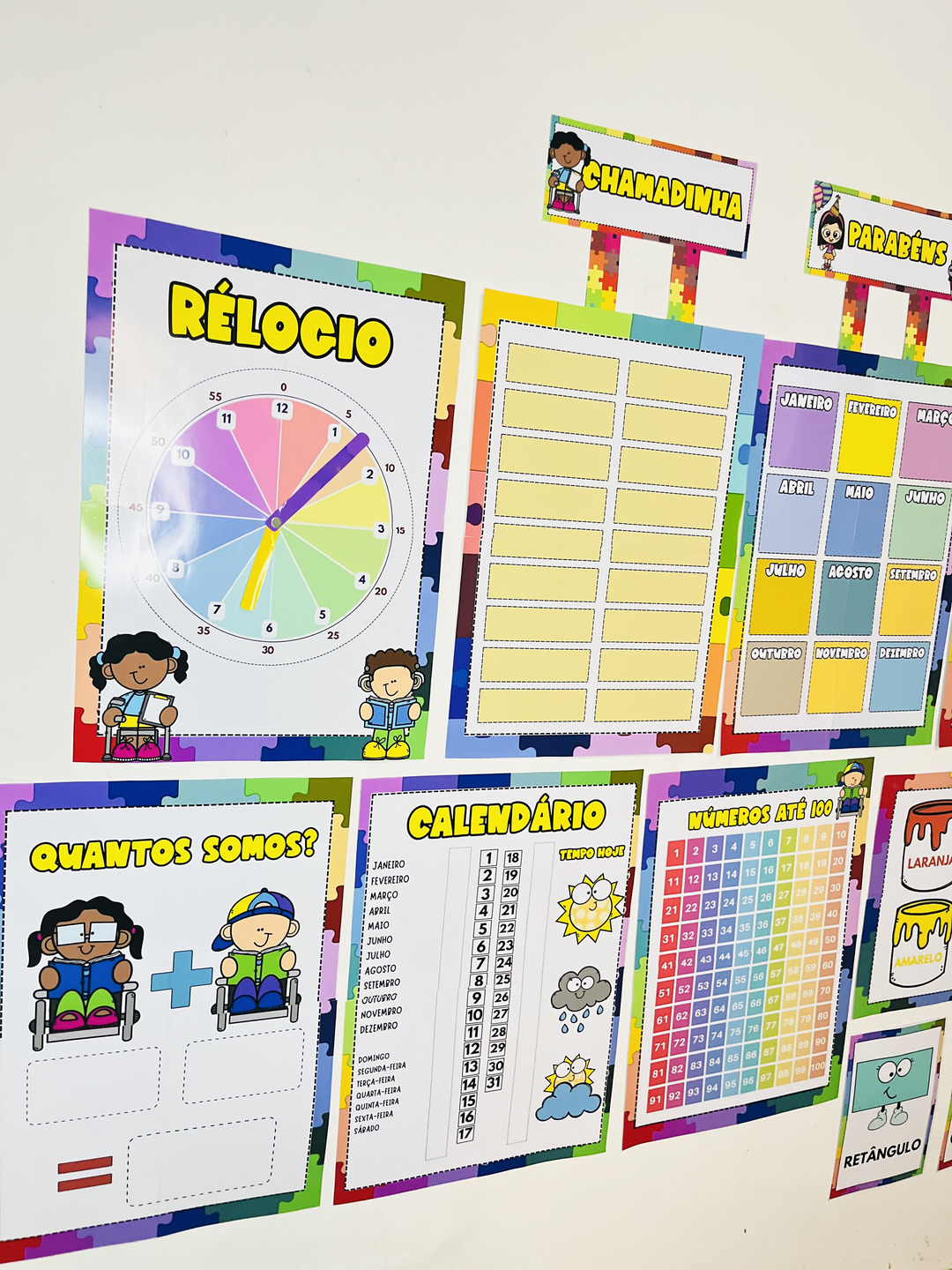Kit Sala de Aula Decorativo - Tema Educação Especial O Kit Sala de Aula Decorativo foi desenvolvido para promover a inclusão e o aprendizado de todos os alunos, independentemente de suas necessidades educacionais. Ideal para ser utilizado tanto em salas de Atendimento Educacional Especializado (AEE) quanto em salas de aula regulares, o kit é uma ferramenta visual e interativa que facilita a comunicação e o aprendizado inclusivo. Este kit acompanha diversos materiais pedagógicos essenciais para enriquecer o ambiente escolar, entre eles: • Alfabeto com Descrição em Libras: Auxilia no ensino da língua portuguesa com a inclusão da Língua Brasileira de Sinais, promovendo a comunicação bilíngue. • Vogais em Libras: Oferece recursos para o aprendizado das vogais de forma acessível e interativa. • Calendário: Para organizar o tempo de maneira visual, facilitando a compreensão dos dias, meses e datas. • Chamadinha: Para marcação de presença, estimulando a interação de todos os alunos. • Aniversariantes: Um painel colorido e animado para celebrar os momentos especiais da turma. • Relógio: Para o ensino das horas e a compreensão do tempo de maneira simples e clara. • Números até 100: Auxilia no aprendizado da numeração e das operações matemáticas. • Números até 10: Ideal para a introdução ao conceito de números, abordando de forma concreta e acessível. • Cores e Formas: Para trabalhar a identificação e o reconhecimento de cores e formas geométricas. • Quantos Somos: Estimula a contagem e o aprendizado de números de maneira visual e inclusiva. • Silabário: Facilita a leitura e escrita de forma lúdica e acessível a todos os alunos. • Brinde - Crachá de Mesa com Alfabeto: Personalizado com o alfabeto, incentivando a interação e o aprendizadono espaço individual de cada aluno. Com este kit, a inclusão torna-se uma prática cotidiana, proporcionando a todos os alunos, com ou sem necessidades especiais, um ambiente de aprendizado mais acolhedor, interativo e acessível. A diversidade é respeitada e estimulada, e todos os alunos, independentemente de suas habilidades, têm a oportunidade de aprender e se expressar de maneira plena.