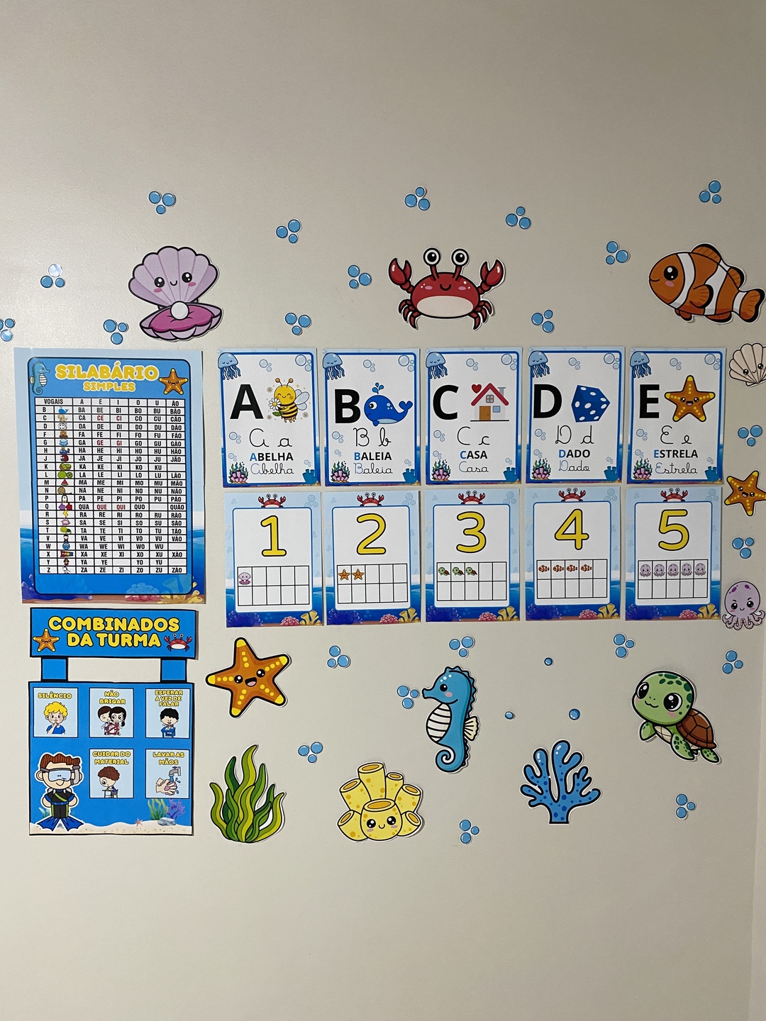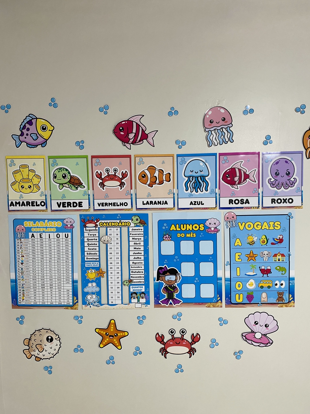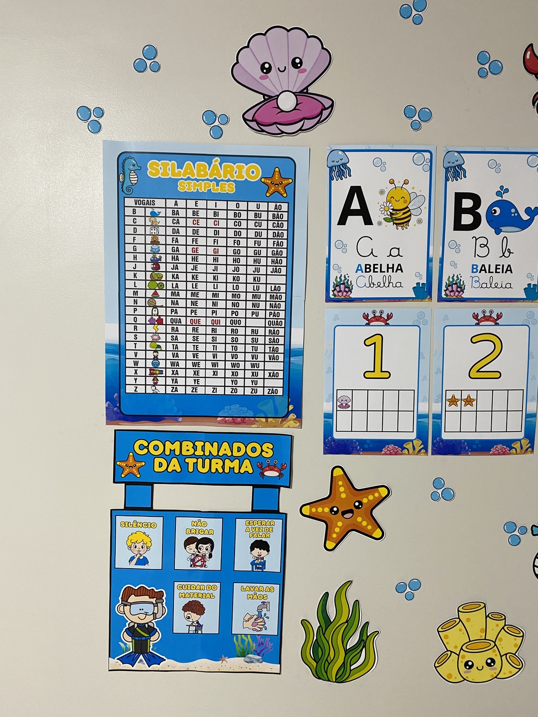 🐠 Kit Sala – Fundo do Mar Transforme sua sala em um verdadeiro mergulho encantador! O Kit Sala Fundo do Mar foi criado com muito carinho para deixar o ambiente ainda mais acolhedor, organizado e lúdico para as crianças. Um material completo, colorido e totalmente pronto para imprimir! ✨ O que acompanha o kit? 🐚 Alfabeto ilustrado completo no tema fundo do mar 🐬 Números de 1 a 10 com representação de quantidade 🐙 Silabário de sílabas simples 🦀 Silabário de sílabas complexas 🌊 Combinados da turma 📅 Calendário interativo ⭐ Alunos do mês 🎨 As vogais 🎨 As cores 🐟 Figuras decorativas no tema fundo do mar para enfeitar sua sala 🎁 Bônus exclusivo: 👑 Coroas em duas versões 🚪 Decoração de porta + plaquinha de bem-vindos