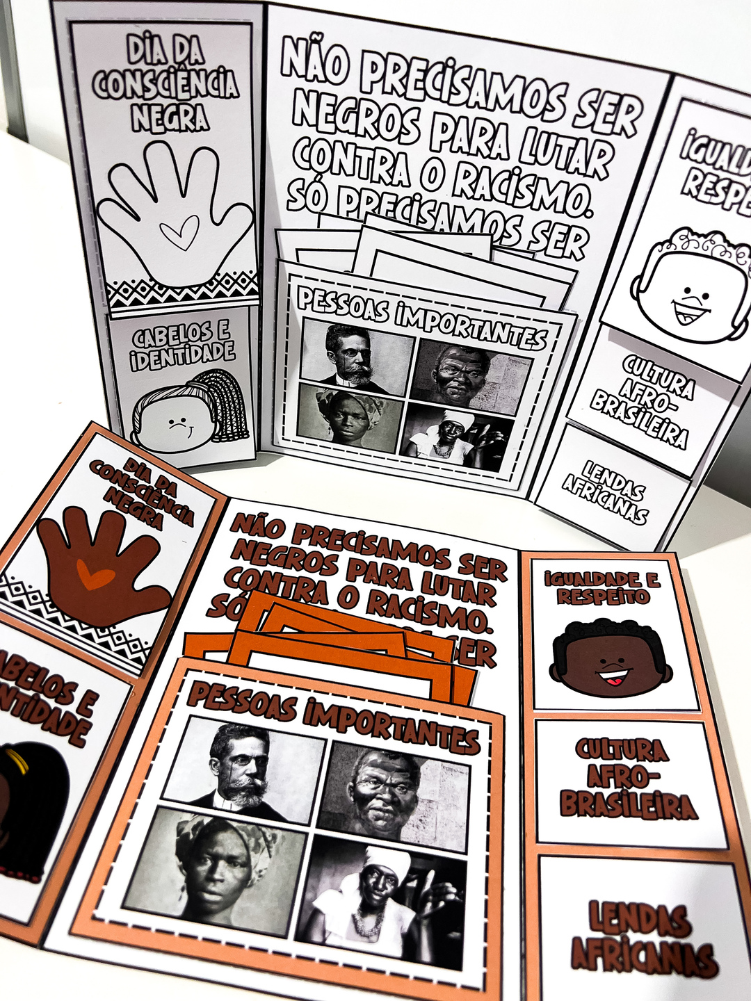 Lapbook Consciência Negra é um material pedagógico interativo desenvolvido para trabalhar o tema do Dia da Consciência Negra, comemorado em 20 de novembro. Disponível nas versões colorida e para colorir, o recurso incentiva o aprendizado de forma lúdica, promovendo reflexões sobre identidade, igualdade e respeito. O material é composto por abas e dobraduras temáticas que abordam tópicos como: - Dia da Consciência Negra – explicação sobre a data e seu significado; - Cabelos e Identidade – valorização da estética e da cultura negra; - Pessoas Importantes – espaço para conhecer figuras históricas de destaque na luta - contra o racismo; - Igualdade e Respeito – incentivo à empatia e à convivência harmoniosa; - Cultura Afro-Brasileira – reconhecimento das contribuições africanas para a formação do Brasil; - Lendas Africanas – resgate da oralidade e das tradições do continente africano.