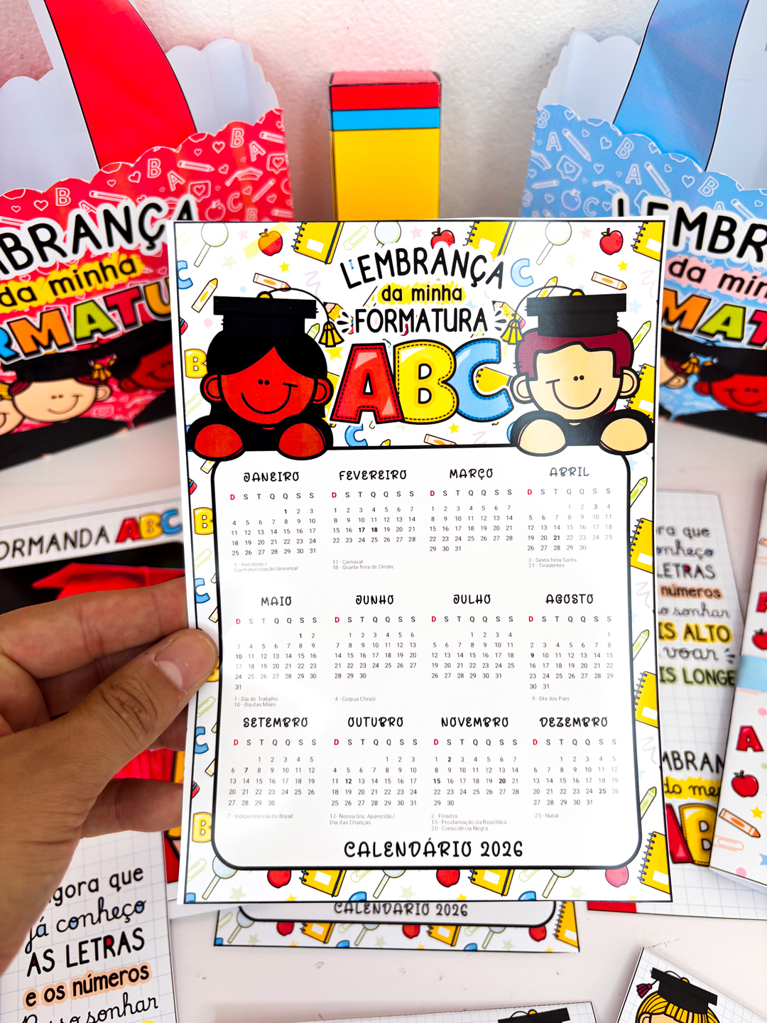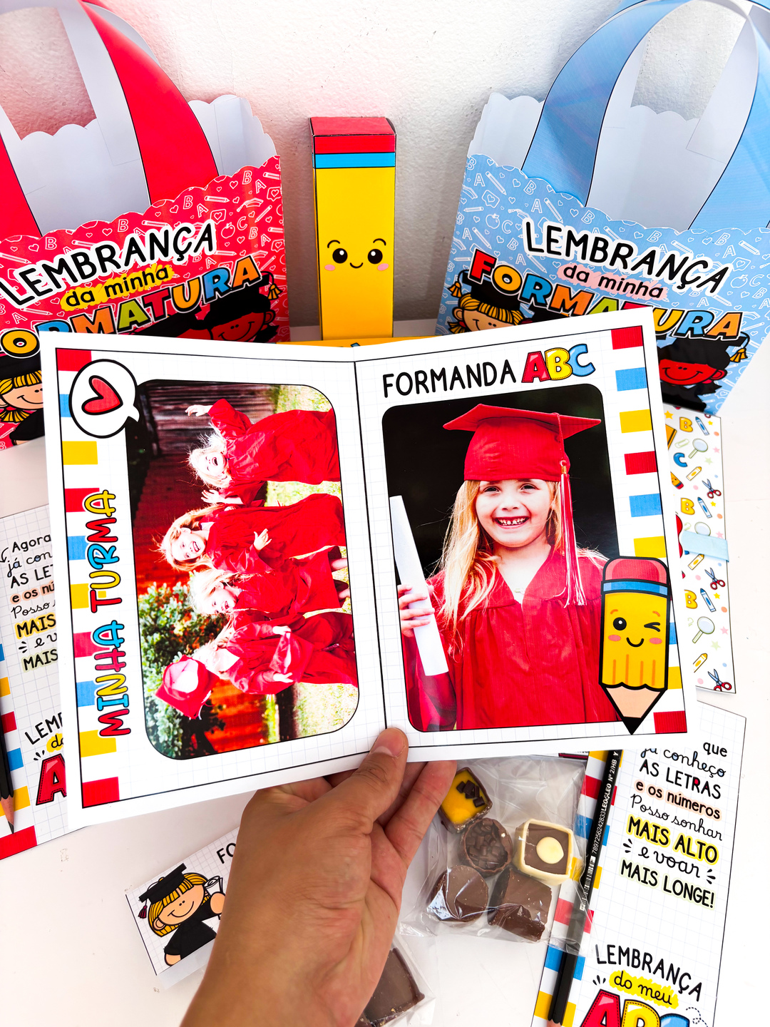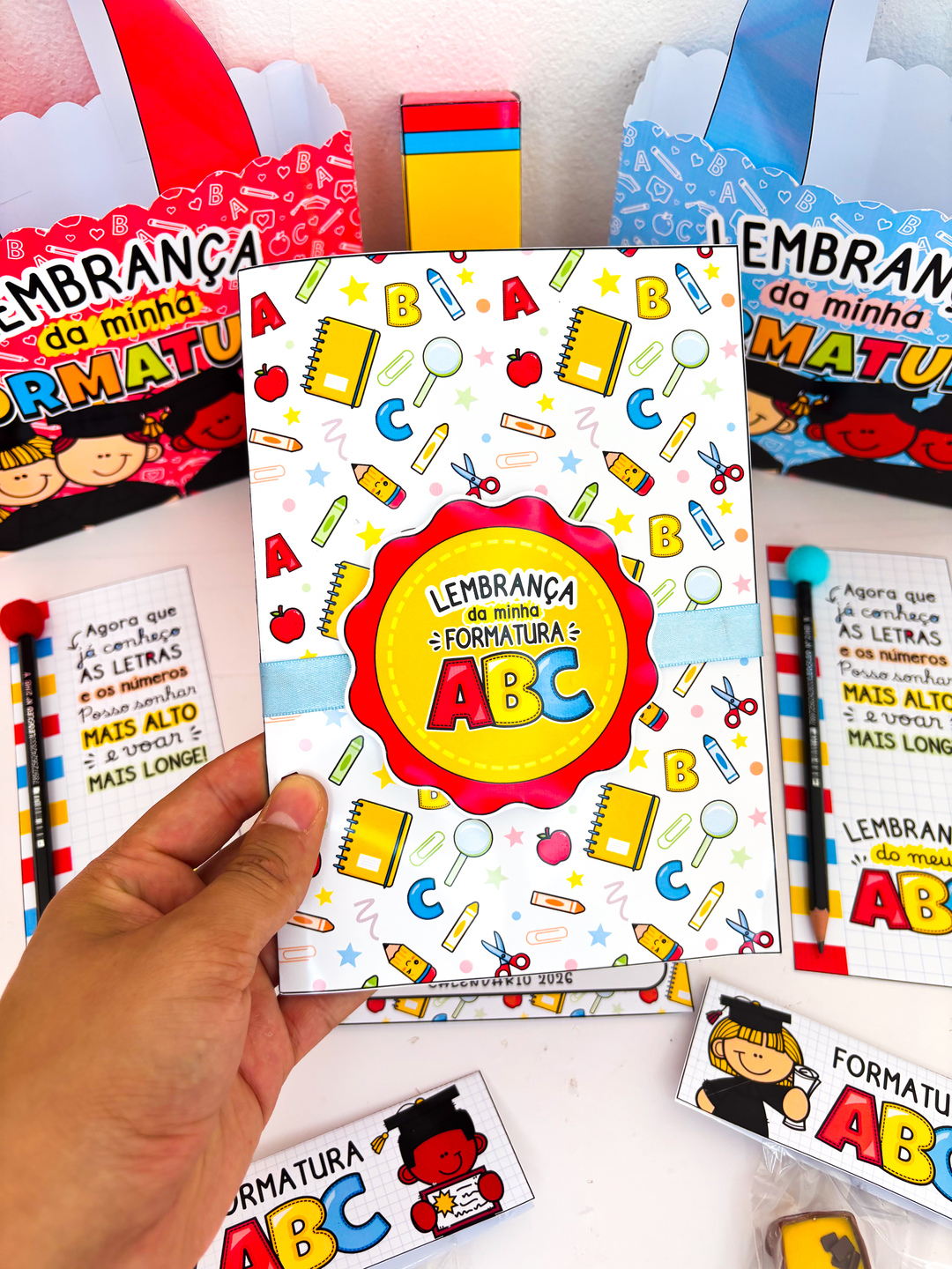 A formatura do ABC é um momento único… e nada melhor do que surpreender seus pequenos formandos com uma lembrança cheia de amor e cuidado! 💛 Essa sacola personalizada, disponível em duas cores lindas, foi pensada para transformar a entrega dos mimos em um momento inesquecível. E o melhor: ela vem com tutorial de montagem passo a passo, pra você montar tudo com praticidade e deixar cada detalhe perfeito! Dentro dela, você encontra um verdadeiro kit de carinho: 📸 Cartão personalizável com a foto do formando e da turma — um registro pra guardar pra sempre; ✏️ Cartão lápis e caixa lápis para guloseimas — porque todo formando merece um doce toque de alegria; 🎁 Lapela para saquinho, pra deixar o presente ainda mais caprichado; 📅 E um Calendário 2026, pra começar o novo ciclo cheio de boas lembranças. Tudo pronto em PDF para impressão, com design encantador e pensado especialmente para professoras que amam surpreender suas turminhas com criatividade e afeto!