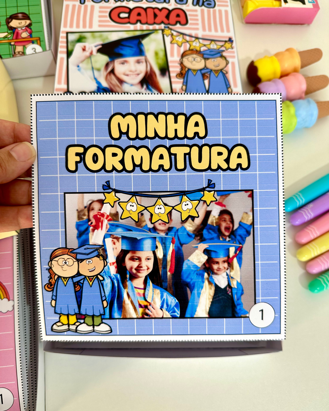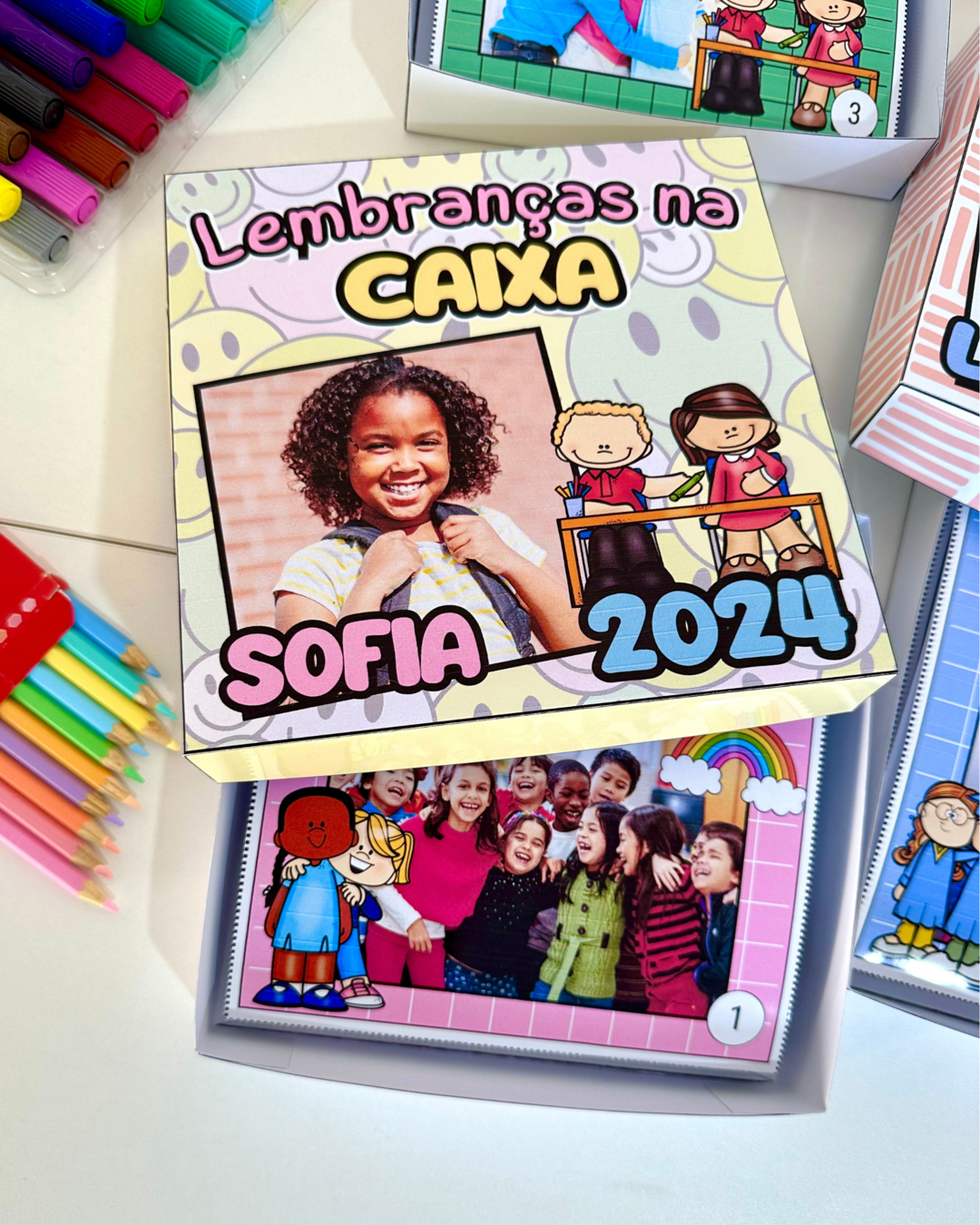 Material Formatura na Caixa e Lembranças na Caixa para utilizar com turmas de Educação Infantil. Opção para transformar as lembranças em memórias registradas com fotos, recados e desenhos. O material vai com registros em formato de caixa, e ao adquirir você recebe um link de edição para alterar fotos e textos e vídeos tutoriais. O arquivo vai em PDF pronto para impressão.