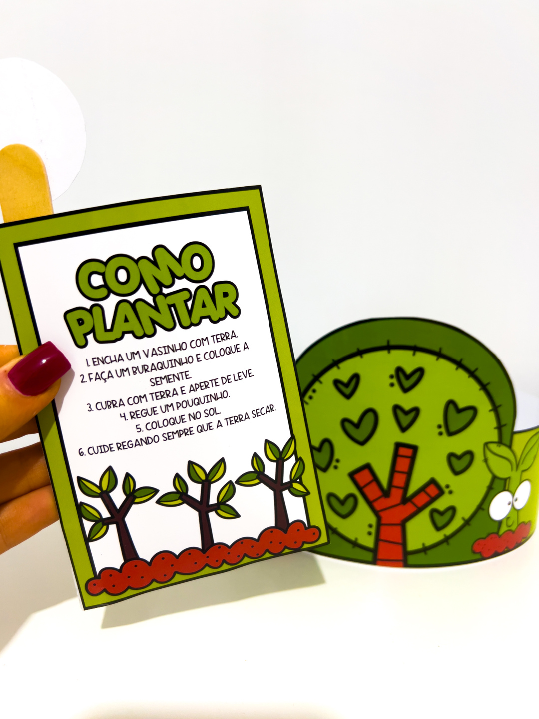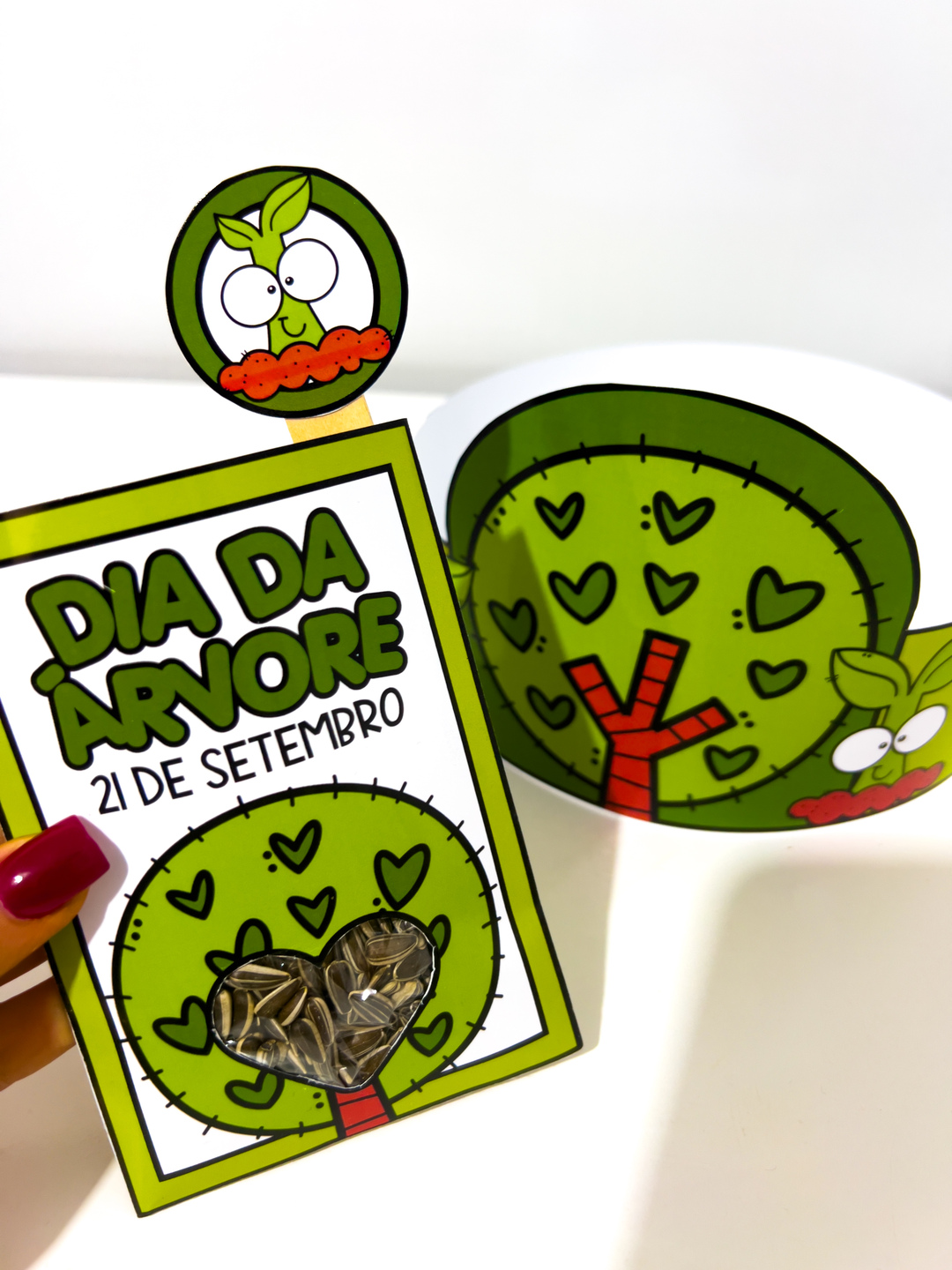 Lembrancinhas Dia da Árvore Essas lembrancinhas fazem parte do material pedagógico criativo e lúdico para trabalhar o Dia da Árvore (21 de setembro) com as crianças. O conjunto é composto por dois itens: - Cartão para sementes – Decorado com ilustrações coloridas e divertidas de árvores, o cartão possui um espaço em formato de coração para identificação das sementes, acompanhado de instruções simples de plantio no verso. Ele incentiva a prática do cuidado com a natureza e a vivência do ciclo de crescimento das plantas. - Coroa temática – Em formato de árvore, a coroa é um acessório que as crianças podem usar durante atividades e celebrações do Dia da Árvore. Além de deixar o momento mais divertido, reforça a mensagem de valorização e preservação da natureza.