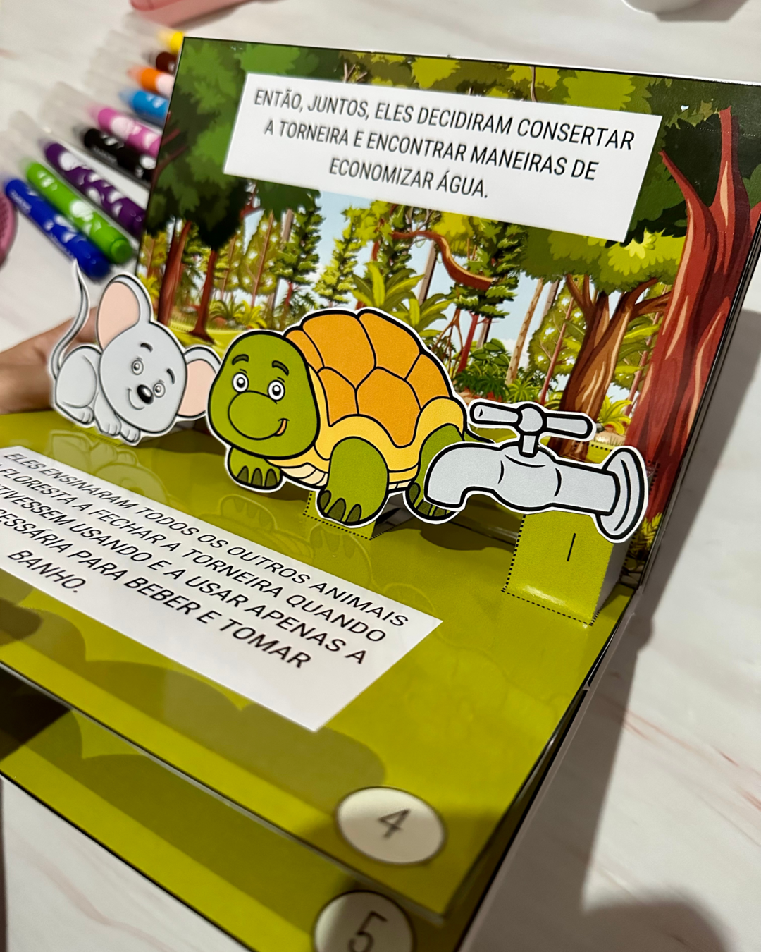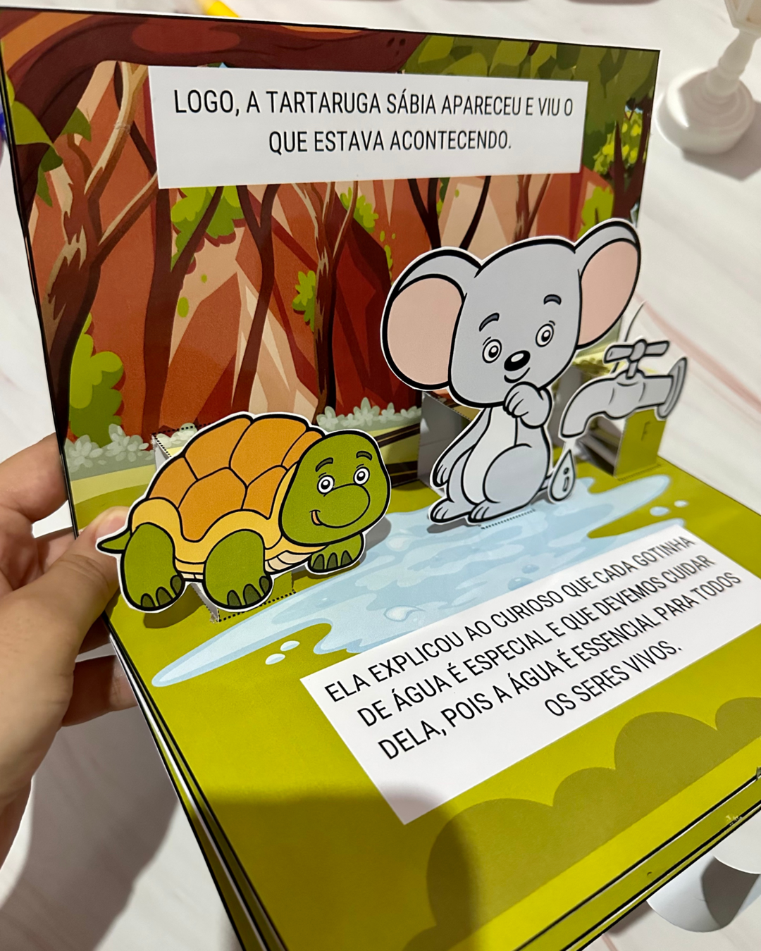 Livro 3D “O Tesouro na Floresta” para trabalhar sobre a importância de cuidarmos da água e a utilizarmos com consciência. Arquivo em PDF com 18 páginas, vai pronto para impressão, e também acompanha vídeo tutorial da montagem. Esse é um recurso lúdico e encantador para trabalhar o tema Água com crianças da Educação Infantil. Recomenda-se utilizar papel de gramatura e cola de silicone líquida para fazer a montagem do recurso.