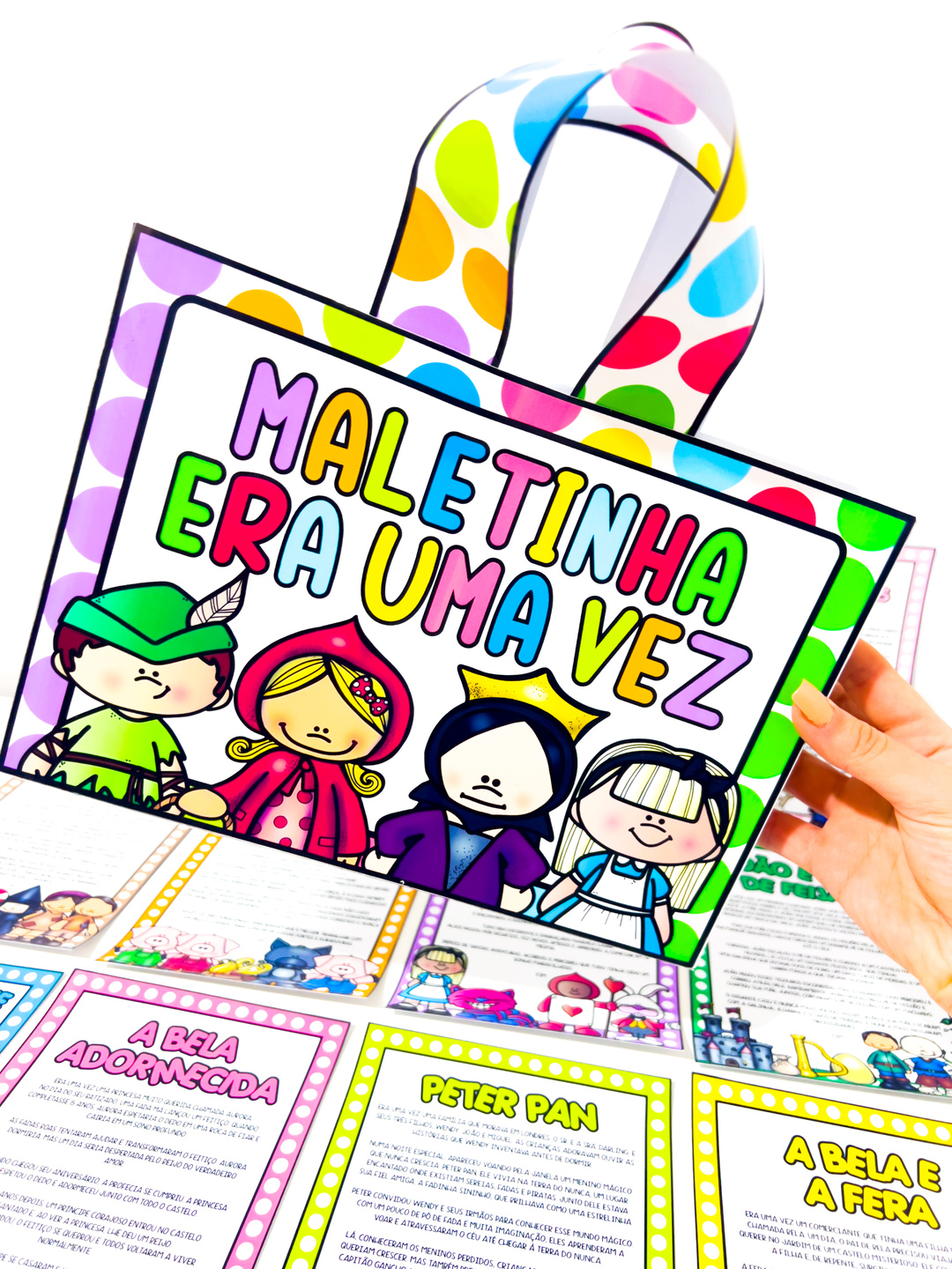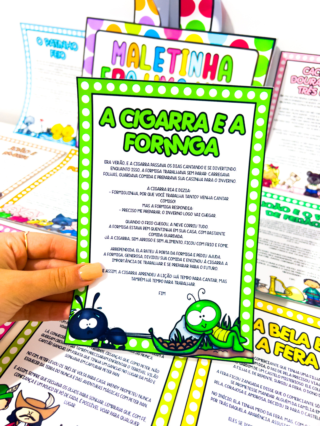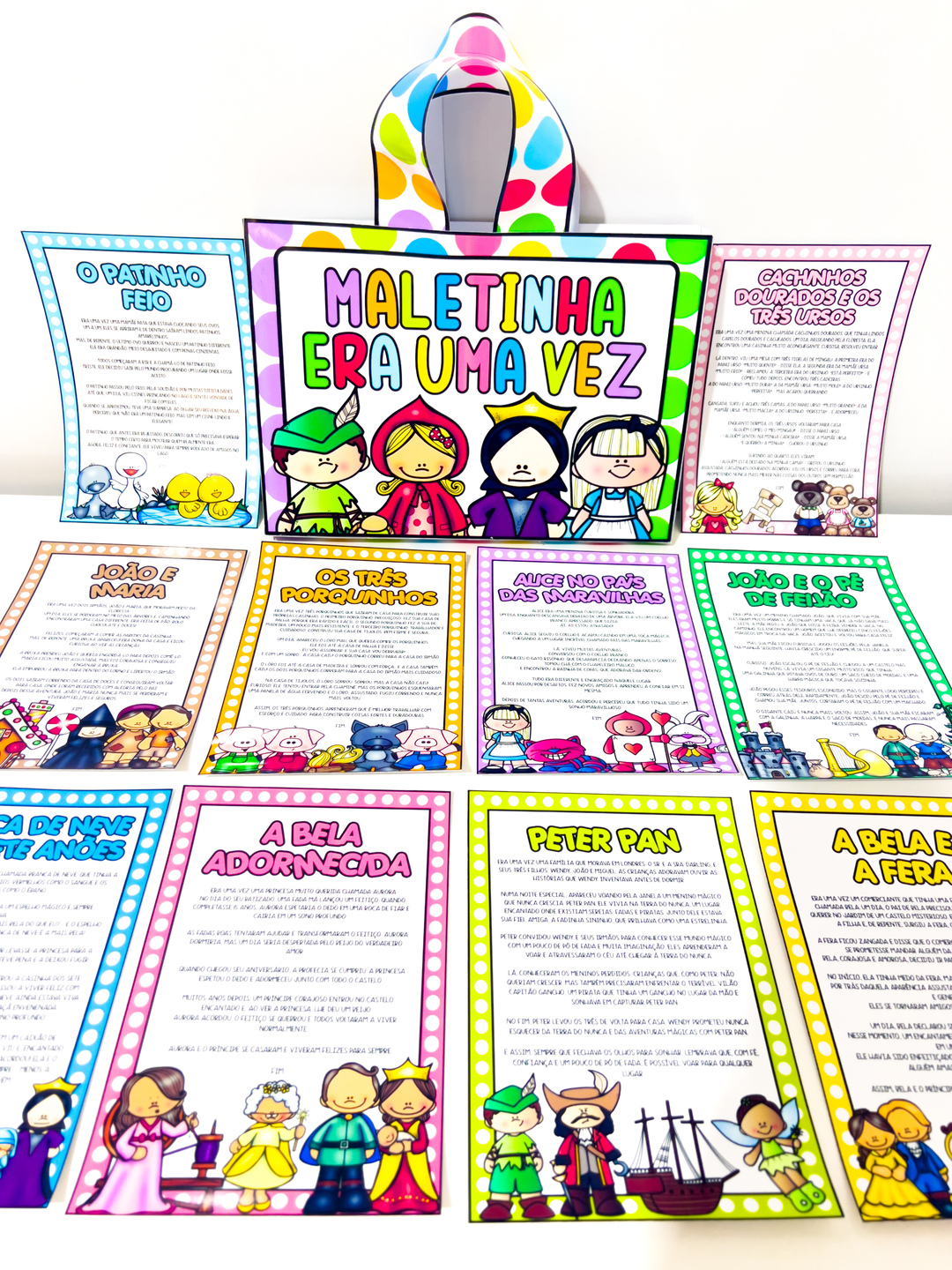 Os contos estão disponíveis em dois formatos: meia folha e folha inteira, facilitando a adaptação de acordo com a necessidade do professor ou da criança.