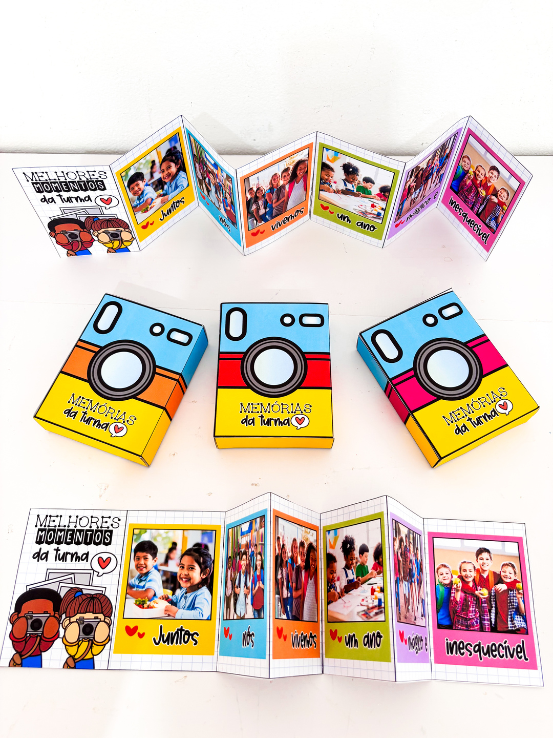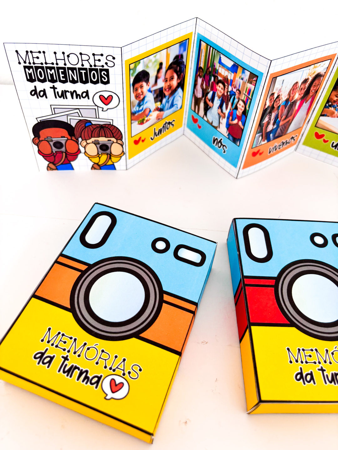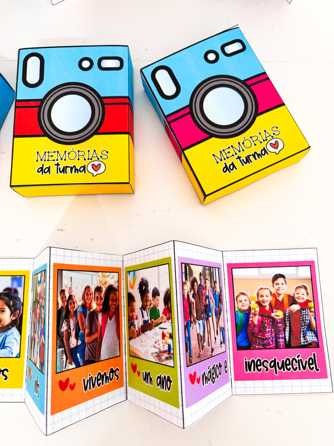 ✨ Clique, sorria e guarde pra sempre! 📸💛 O material Memórias da Turma é uma caixinha em formato de câmera que guarda os melhores cliques do seu ano! Dentro dela, polaroids no estilo Zig e Zag revelam uma mensagem especial: “Juntos nós vivemos um ano mágico e inesquecível!” ✨ Uma lembrancinha criativa, cheia de emoção e significado, pra eternizar os momentos que fizeram sua turma sorrir, aprender e crescer. 💫 🖼️ Totalmente editável nas fotos e na frase 🎨 Três cores diferentes de câmera pra escolher 📄 Você monta com apenas duas folhas! ✂️ Super fácil de montar e com resultado encantador! 👉 Garanta já o seu e transforme as memórias da sua turma em um registro pra guardar no coração! 💛