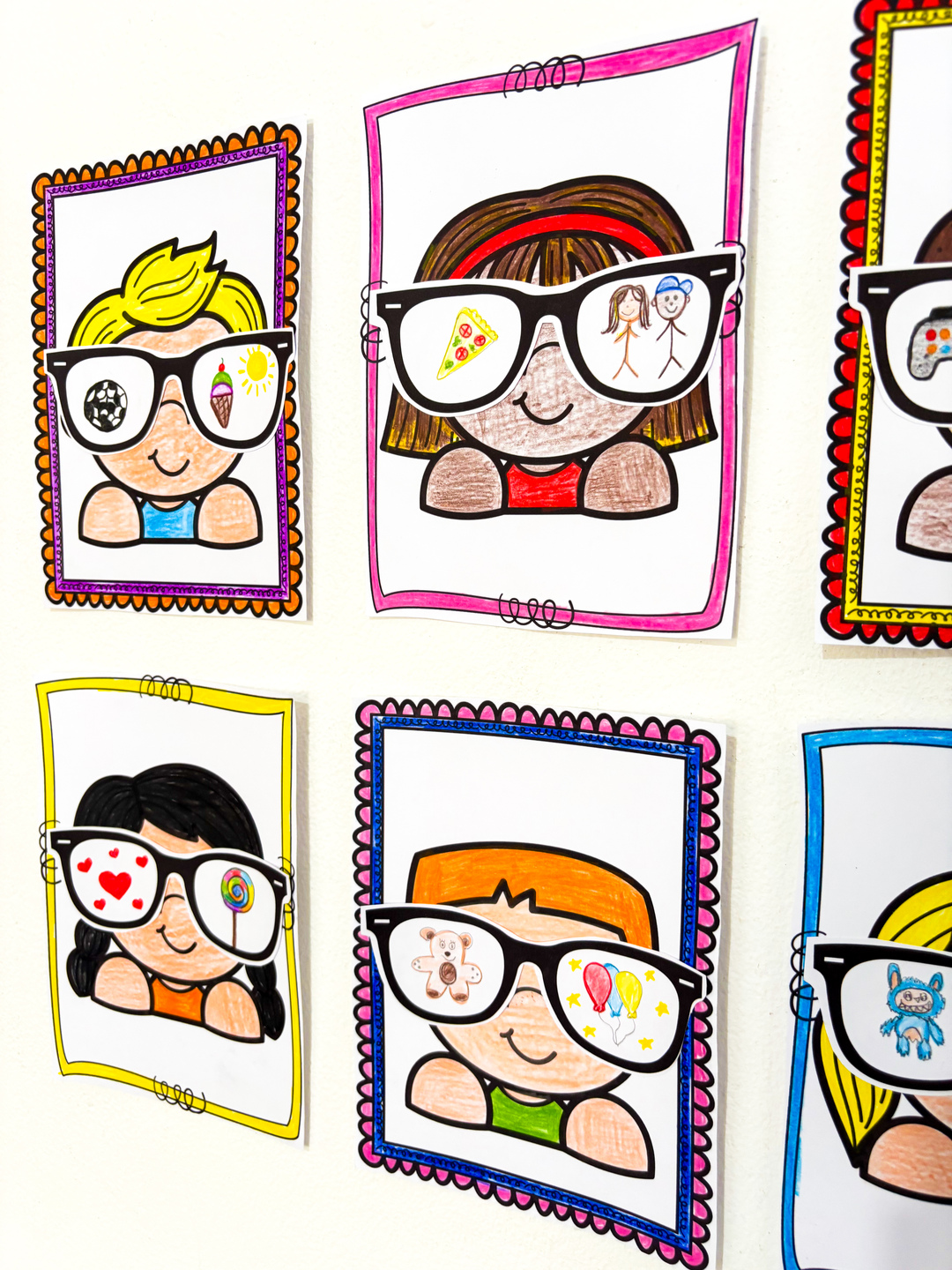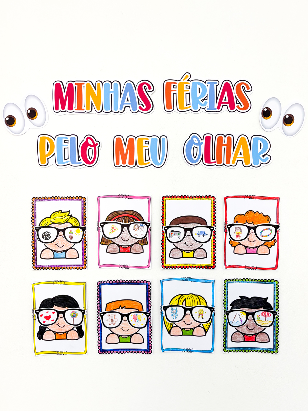 Os alunos desenham nos óculos momentos especiais que viveram nas férias… e é uma delícia ver o que cada criança escolhe registrar. Eles amam, se envolvem e ainda compartilham histórias que ajudam muito na adaptação e na escuta afetiva.