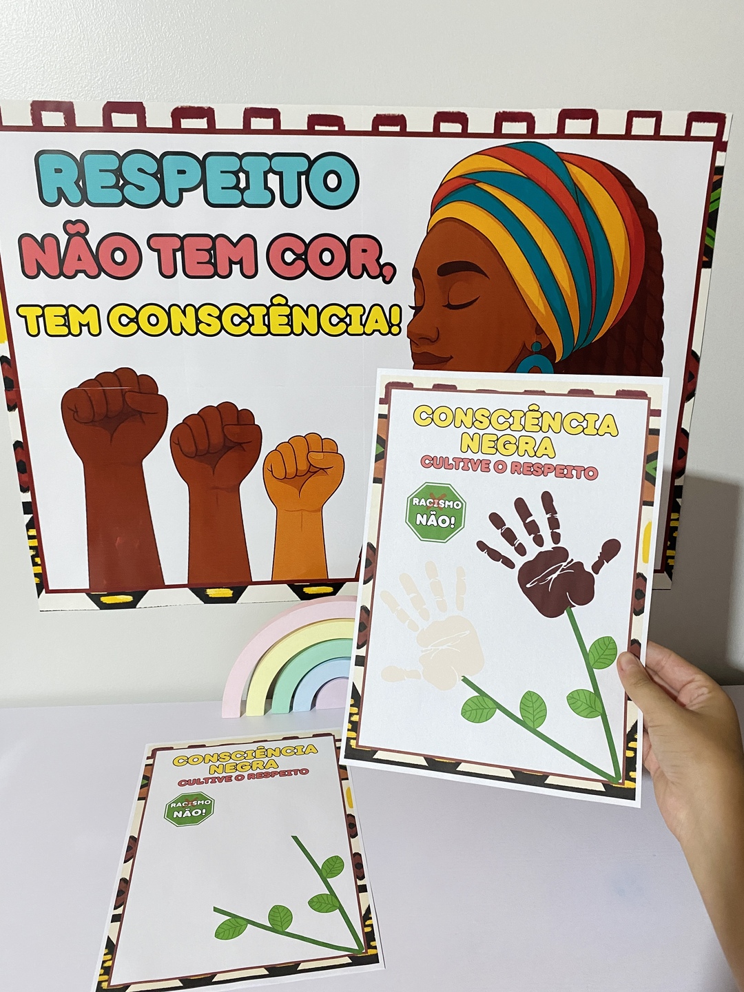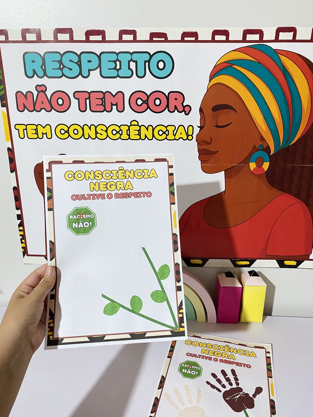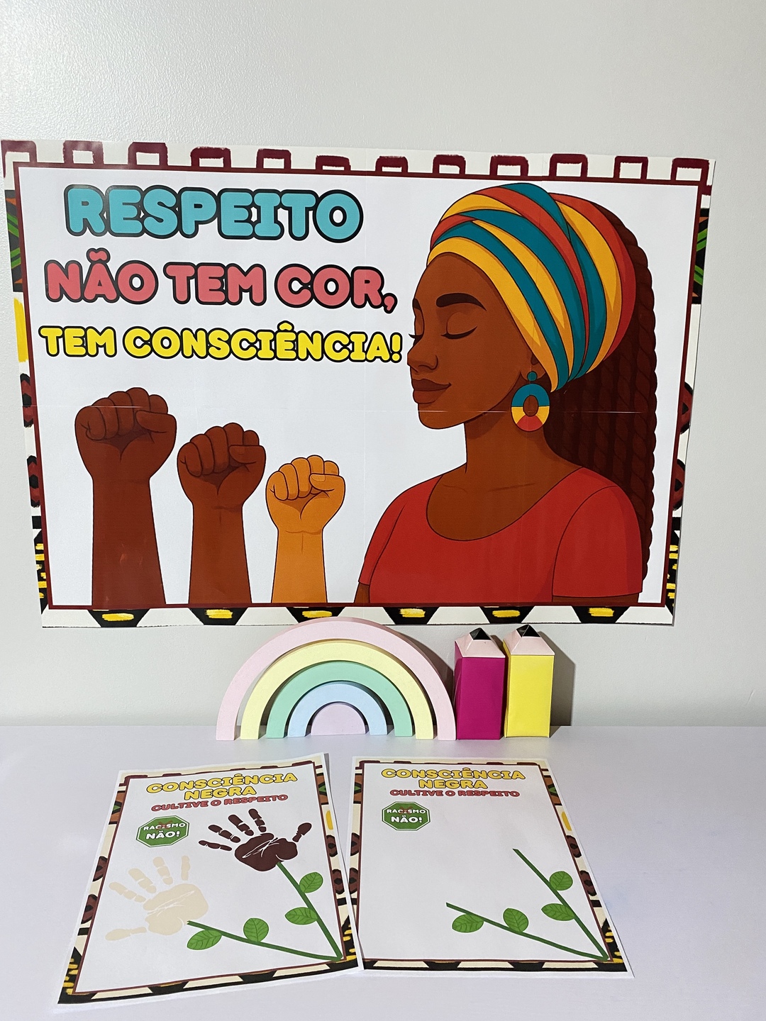 O kit inclui um painel colorido e inspirador com a frase: “Respeito não tem cor, tem consciência!”
