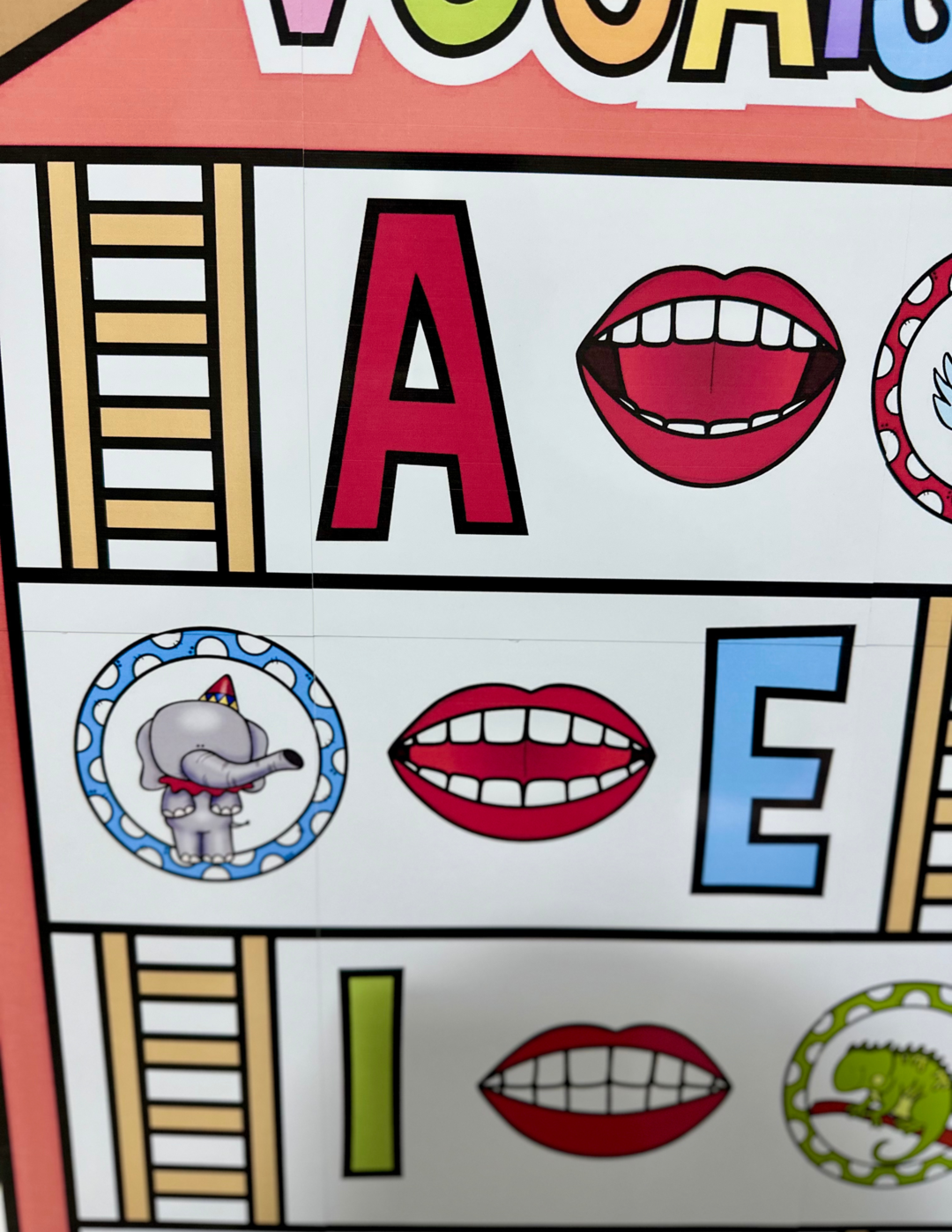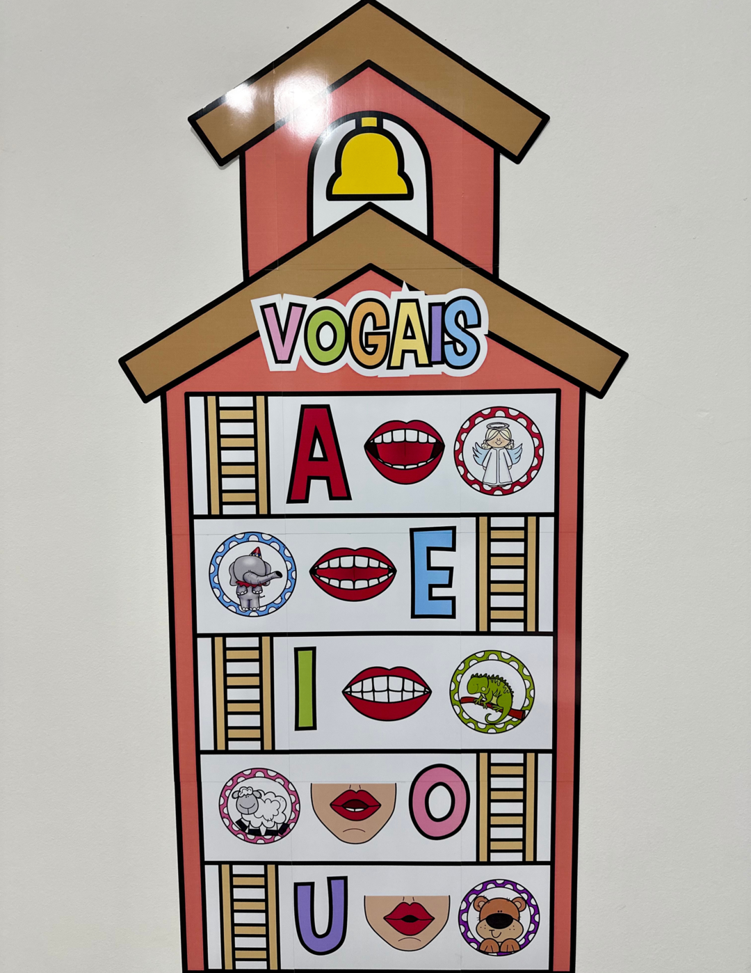 Painel Vogais para trabalhar o tema com crianças da Educação Infantil. Material ilustrado com figuras que iniciam com cada vogal, e também com as boquinhas fono articulatórias representandoo som de cada vogal. Medidas do painel montado: 1,2m de altura e 52cm de largura.