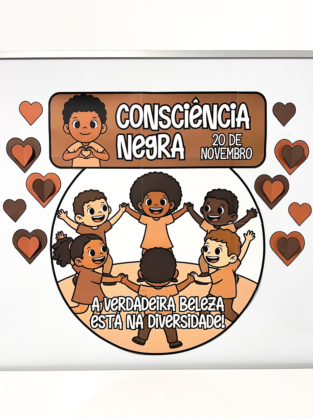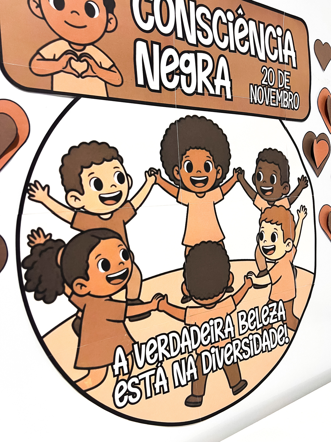 O painel apresenta ilustrações de crianças de diferentes tons de pele, de mãos dadas em círculo, simbolizando união, respeito e valorização da diversidade racial.