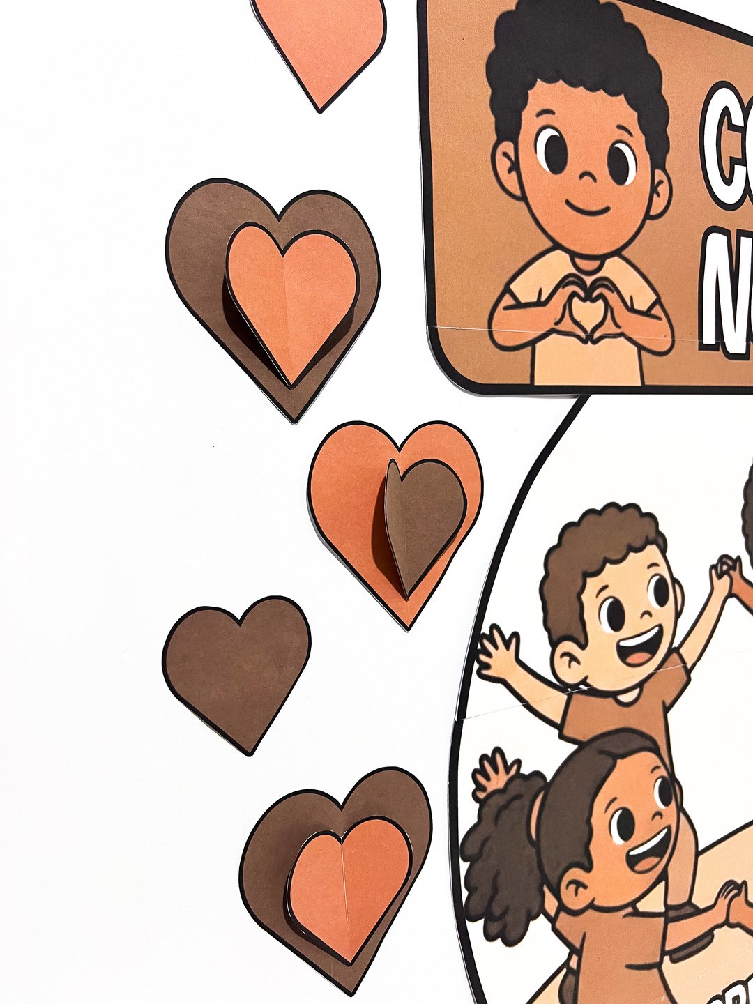 As cores predominantes remetem aos tons de pele e à representatividade étnica, tornando o painel ideal para