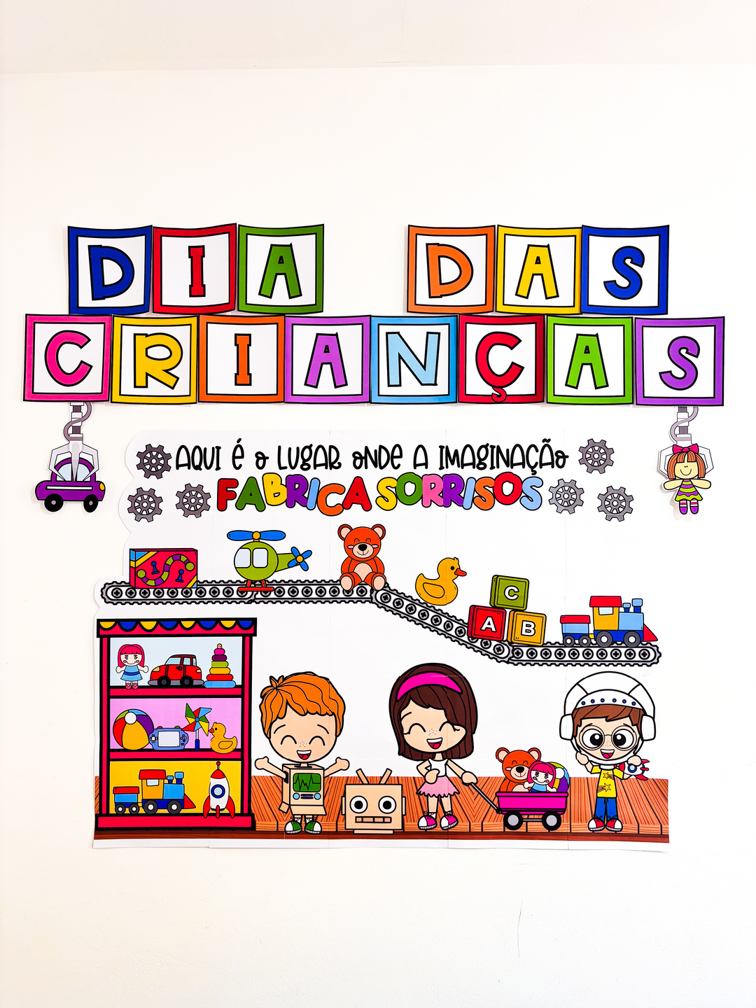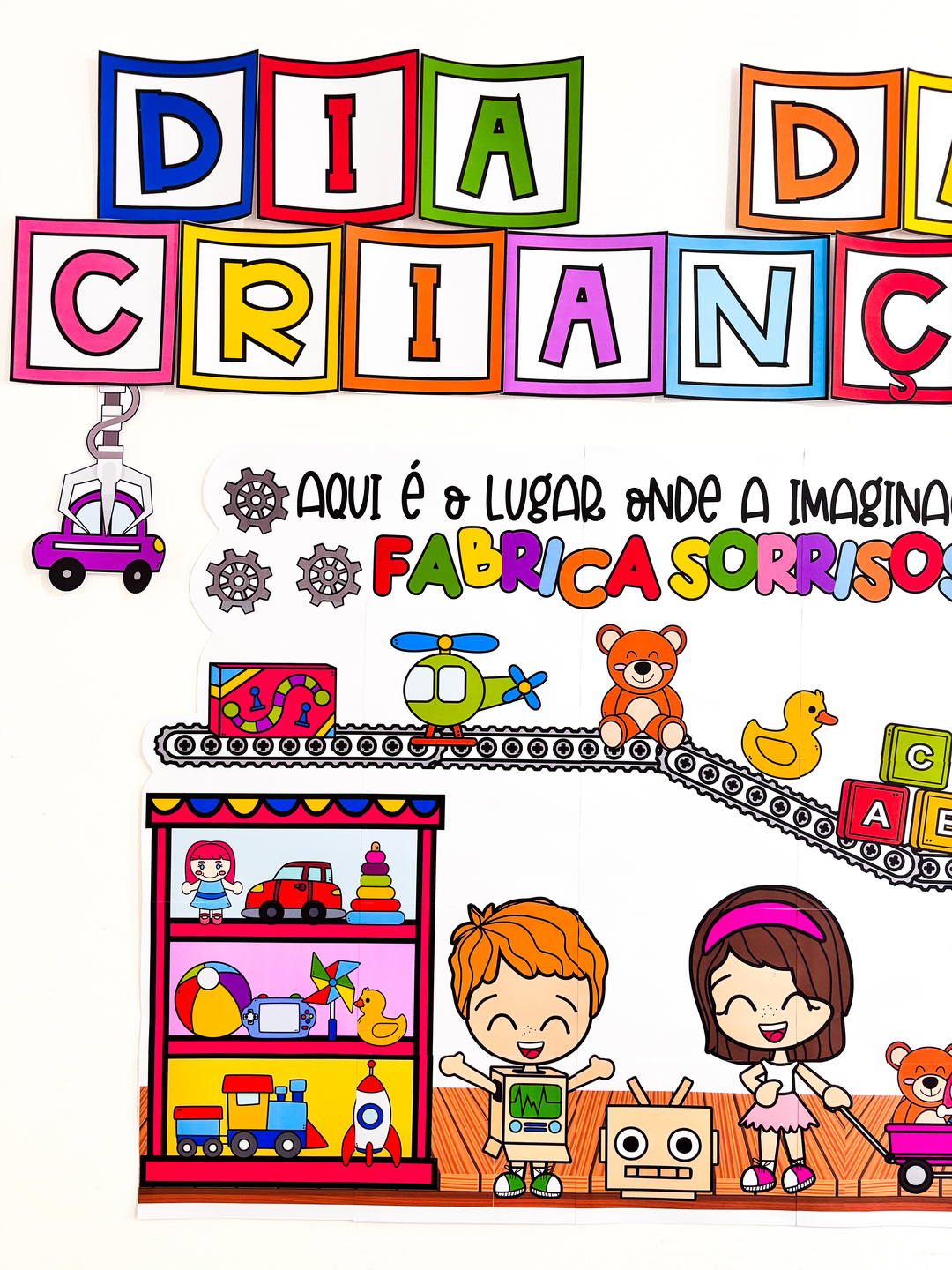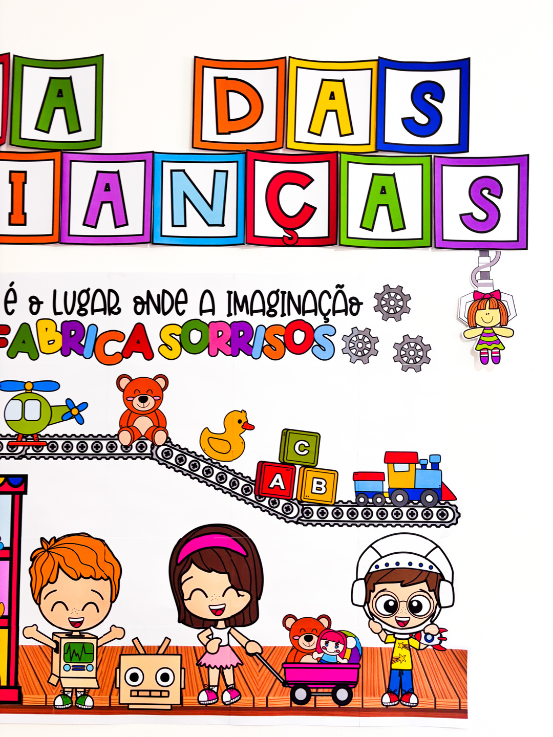 ✨ Uma verdadeira Fábrica de Brinquedos chegou para transformar o Dia das Crianças! Com cores vivas, personagens divertidos e prateleiras cheias de brinquedos, o painel gigante (2,00 x 1,80m) cria um cenário mágico que transporta os pequenos para um mundo de imaginação e alegria. Frase especial em destaque: “Aqui é o lugar onde a imaginação fabrica sorrisos.” Cada detalhe foi pensado para encantar: esteira com brinquedos, engrenagens, crianças felizes e um universo lúdico que resgata o valor do brincar. Vai prontinho para impressão e é garantia de encantar sua turminha no grande dia!