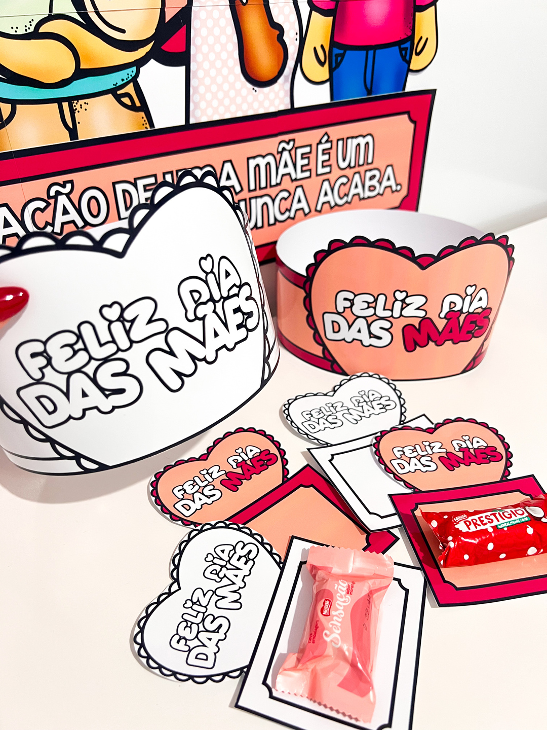 Material pedagógico composto por painel decorativo e lembrancinhas para o Dia das Mães. Traz mensagens de carinho,representatividade e reforça o valor das mães no ambiente escolar. Ideal para atividades afetivas com os alunos. Contem: - Painel de 9 folhas - Porta doce (colorido/para colorir) - Coroa (colorido/para colorir)