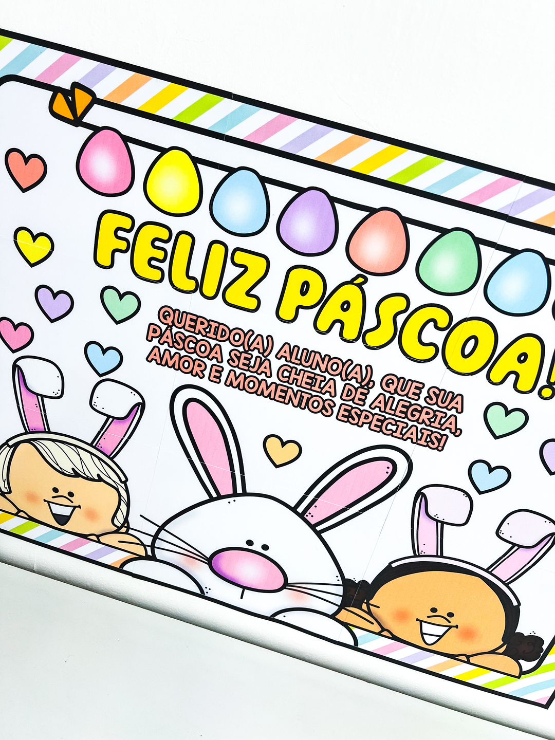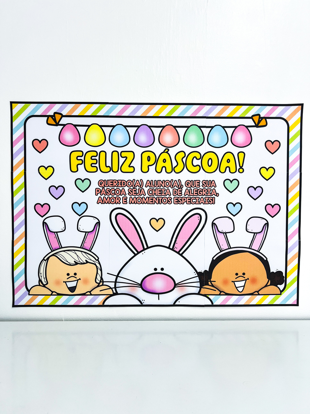 Painel de Páscoa Um recurso encantador para decorar e deixar o ambiente escolar ainda mais alegre nesta Páscoa! O material contém dois tamanhos: 9 ou 16 páginas, formando um lindo painel colorido com tema de coelhinho, perfeito para acolher os alunos com carinho e celebrar esse momento especial. Ideal para salas de aula, murais e espaços educativos. Arquivo em PDF – pronto para imprimir e montar.