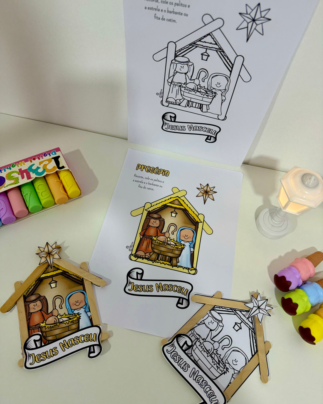 Atividade Presépio de Palitos para trabalhar o Natal com crianças da Educação Infantil e das séries iniciais do Ensino Fundamental. A proposta vai na opção colorida e para colorir, e trabalha coordenação motora fina, criatividade e o verdadeiro sentido do Natal. A atividade também pode ser utilizada como decoração para árvore de Natal ou lembrancinha. O arquivo vai em PDF pronto para impressão.