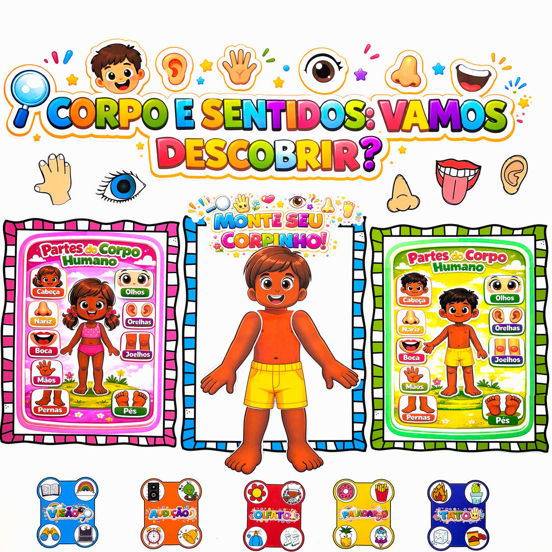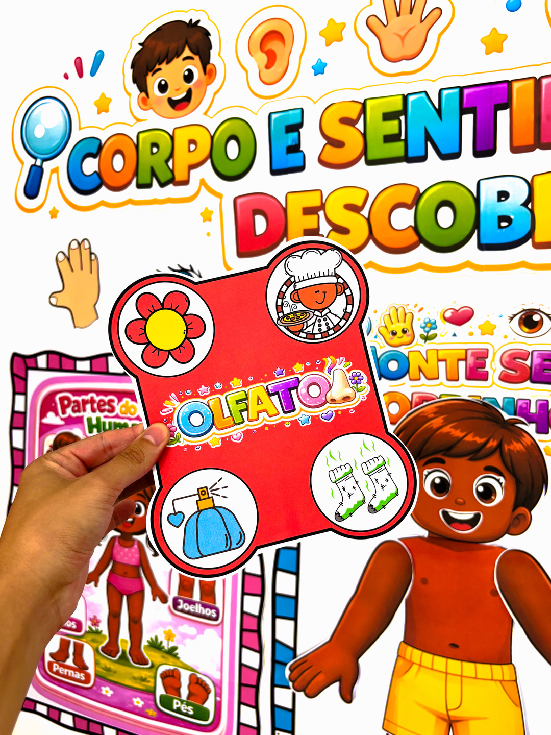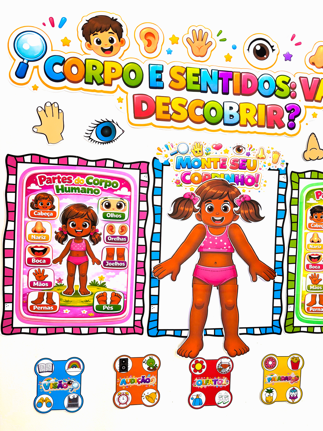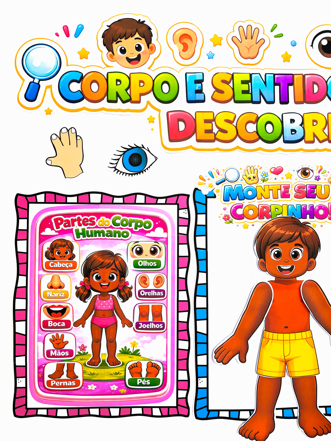 PROFESSORA, OLHA ESSE MATERIAL… Você não vai trabalhar só corpo humano e 5 sentidos…você vai transformar isso em uma experiência COMPLETA, envolvente e inesquecível na sua sala ✨ Um projeto pensado pra Educação Infantil, com tudo pronto pra você aplicar sem dor de cabeça! O QUE VOCÊ RECEBE: - Cartazes partes do corpo (menino e menina) → Perfeitos pra exploração visual e identificação - Atividade coletiva “MONTE SEU CORPINHO” → Interativa, divertida e que prende a atenção na hora! - Painéis “Partes do Corpo Humano” → Ideais pra trabalhar nomeação e associação - Letreiro temático colorido → Pra deixar sua sala linda e temática (aquele toque que encanta) - Fichas dos 5 sentidos (visão, audição, olfato, paladar e tato) → Com ilustrações claras e didáticas + PROJETO PEDAGÓGICO COMPLETO → Com sugestão de aplicação → Ideias de atividades → Organização por etapas → Tudo alinhado com a Educação Infantil