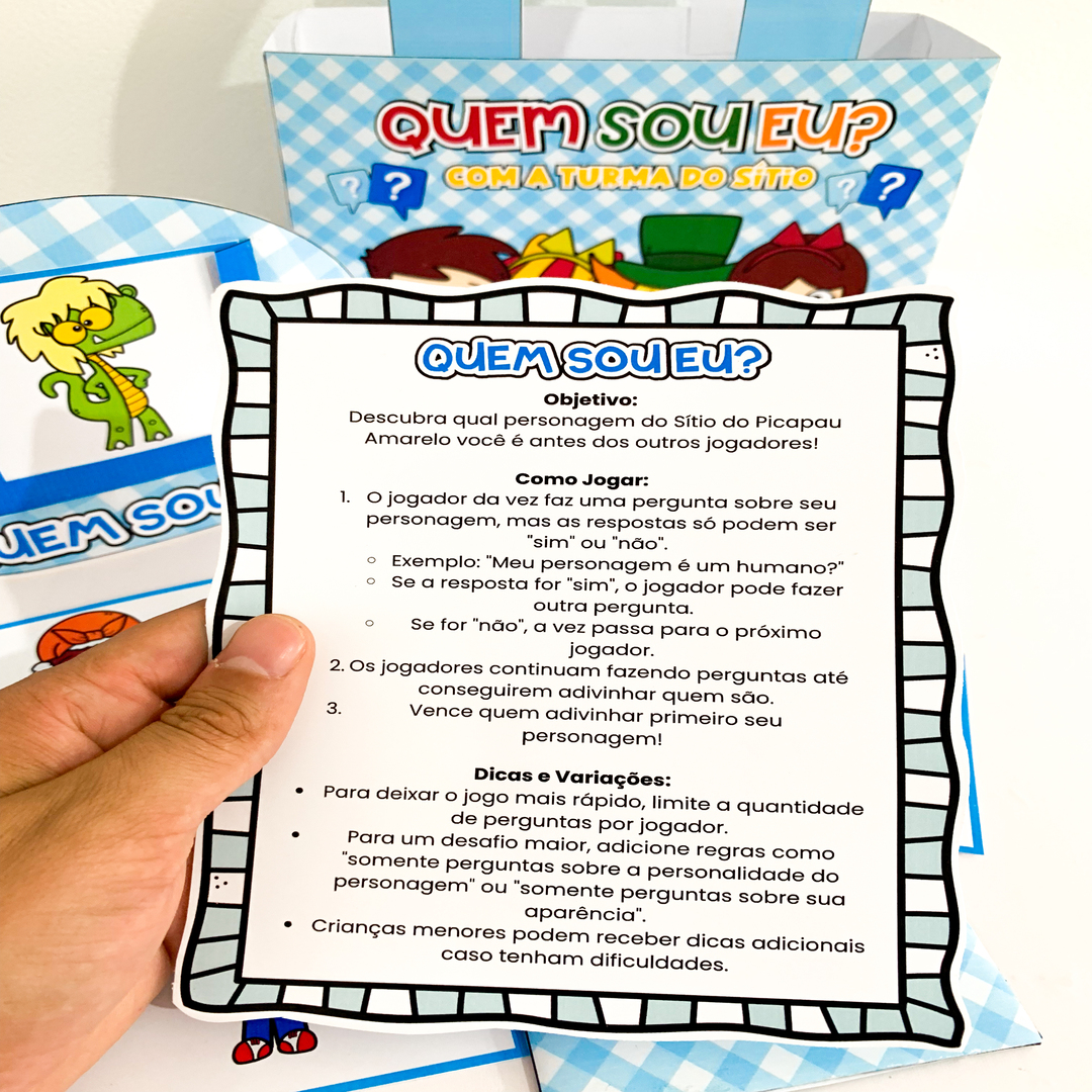 Quem sou eu? – Edição Sítio do Picapau Amarelo Professoras da Educação Infantil e Anos Iniciais, que tal tornar a leitura ainda mais divertida e interativa? Com este jogo inspirado no clássico "Quem Sou Eu?", seus alunos vão se encantar ao descobrir os personagens do Sítio do Picapau Amarelo! O kit inclui: - 1 coroa para os jogadores - 1 envelope com 10 fichas dos personagens - Instruções de jogo - 1 sacola personalizada Além de ser uma ótima opção para o Dia do Livro, este jogo pode ser usado para trabalhar: - Características físicas e de personalidade - Atenção e raciocínio lógico - Expressão oral e interação social - O universo mágico da literatura infantil Transforme a leitura em uma experiência lúdica e inesquecível! Vamos brincar e aprender?