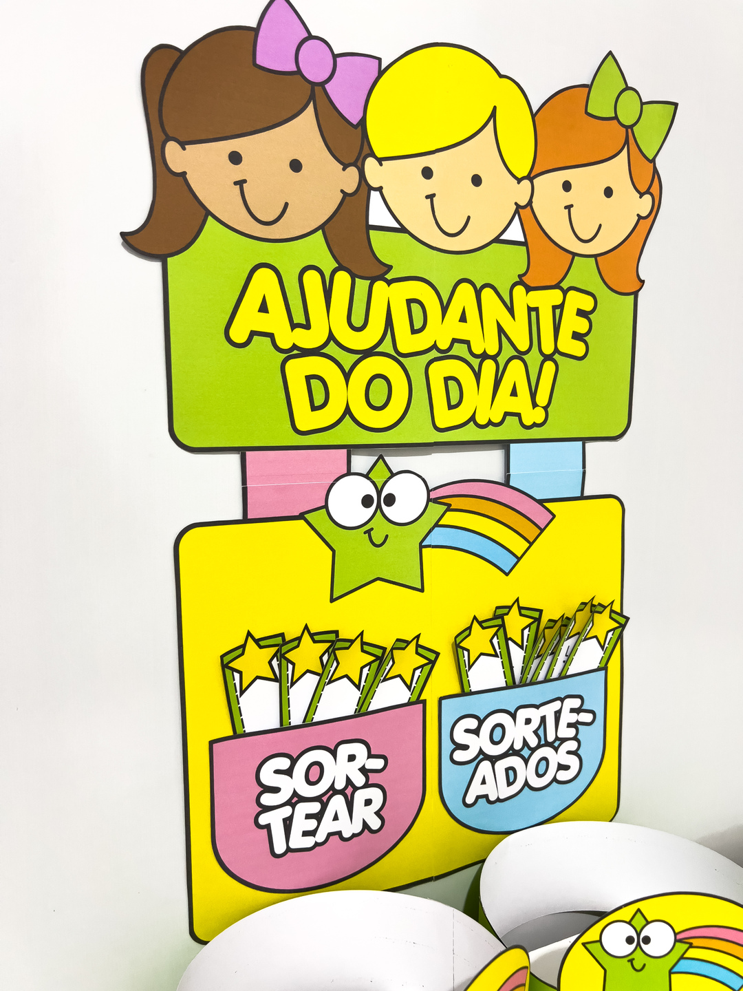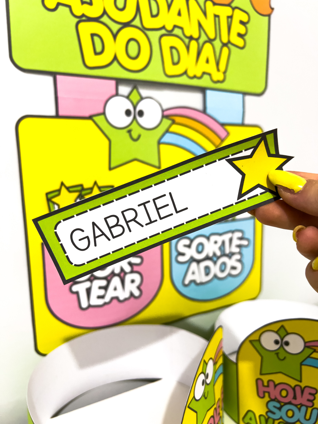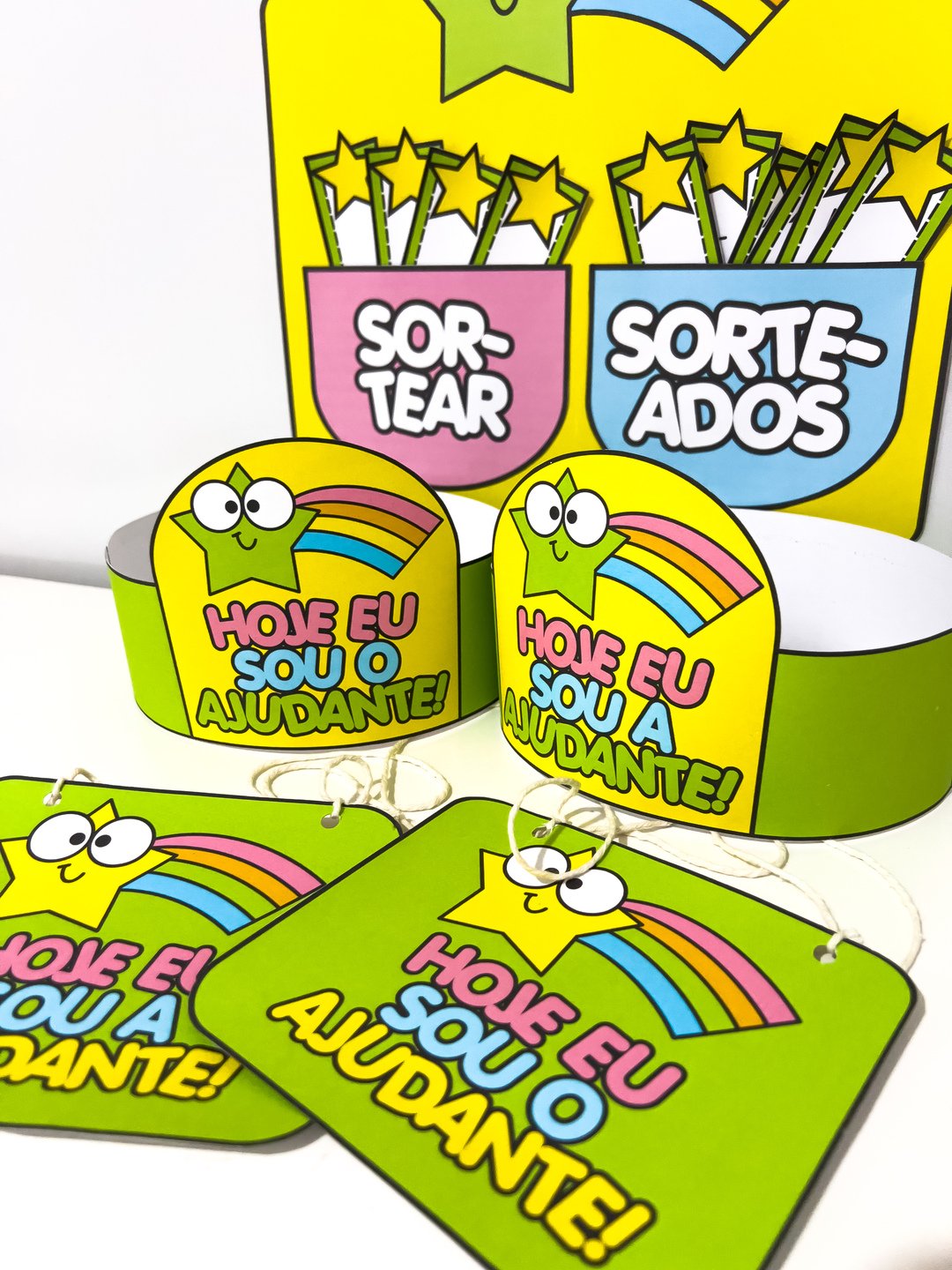O Sorteio de Ajudante do Dia é um material pedagógico pensado para tornar a rotina escolar mais participativa, organizada e divertida. Por meio do sorteio, todas as crianças têm a oportunidade de assumir responsabilidades, fortalecendo a autonomia, o senso de colaboração e o protagonismo em sala de aula. O material contém um painel formado por cinco folhas, ideal para destacar o ajudante escolhido do dia, além de fichas de nomes editáveis no Canva, facilitando a personalização conforme a turma. Acompanha também modelos de coroas e modelos de crachás, que valorizam o papel do ajudante e tornam o momento ainda mais especial para as crianças.